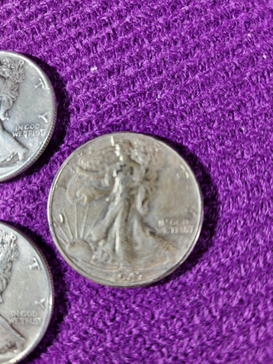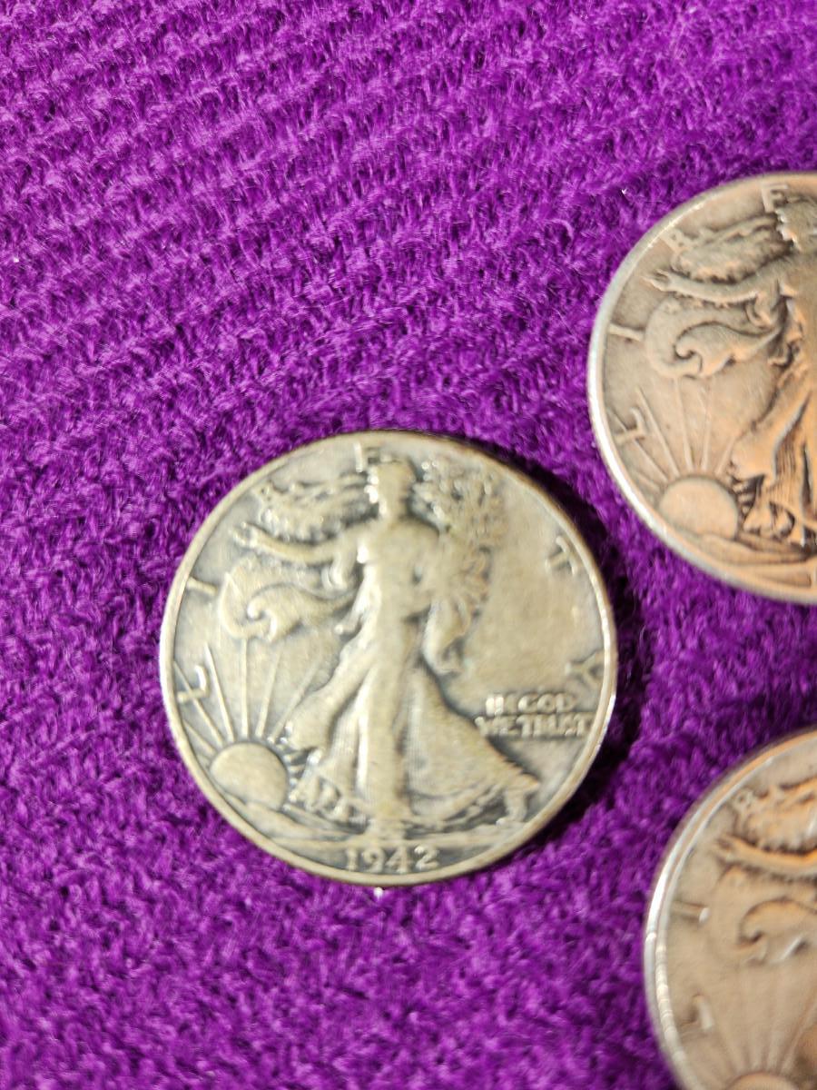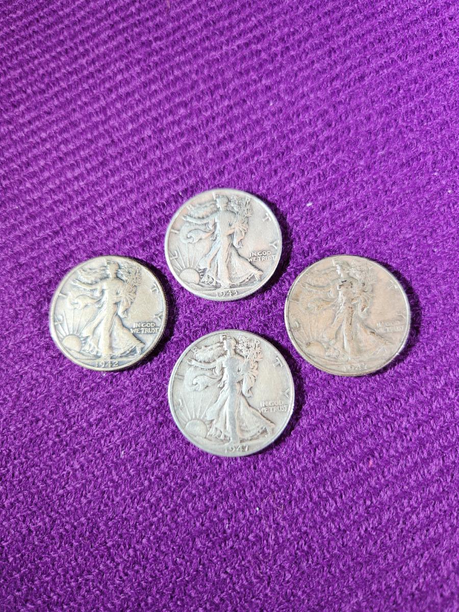 This auction lot is for 4 Walking Liberty Half Dollars. One is a 1942, another is a 1943, and the remaining two coins are dated 1947. The coins are 90% Silver. See photos for condition.