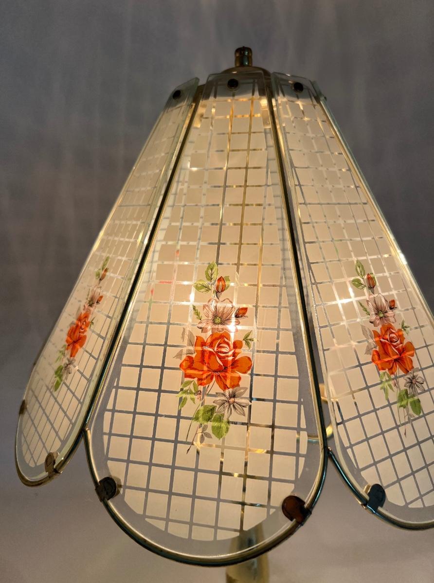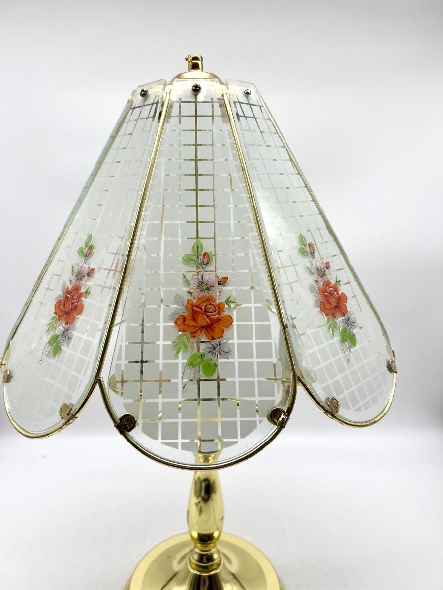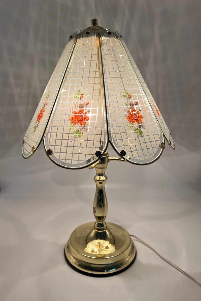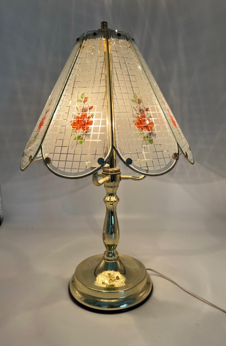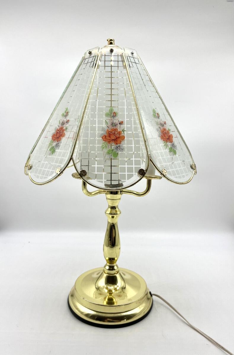 4 way pink floral touch lamp Measures 22 inches tall with 8 glasses panels, 3 bulbs included.