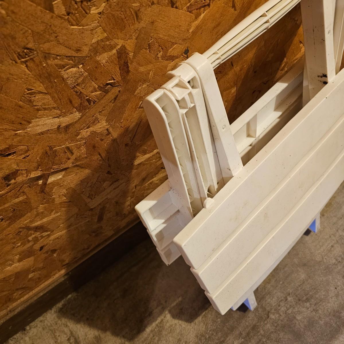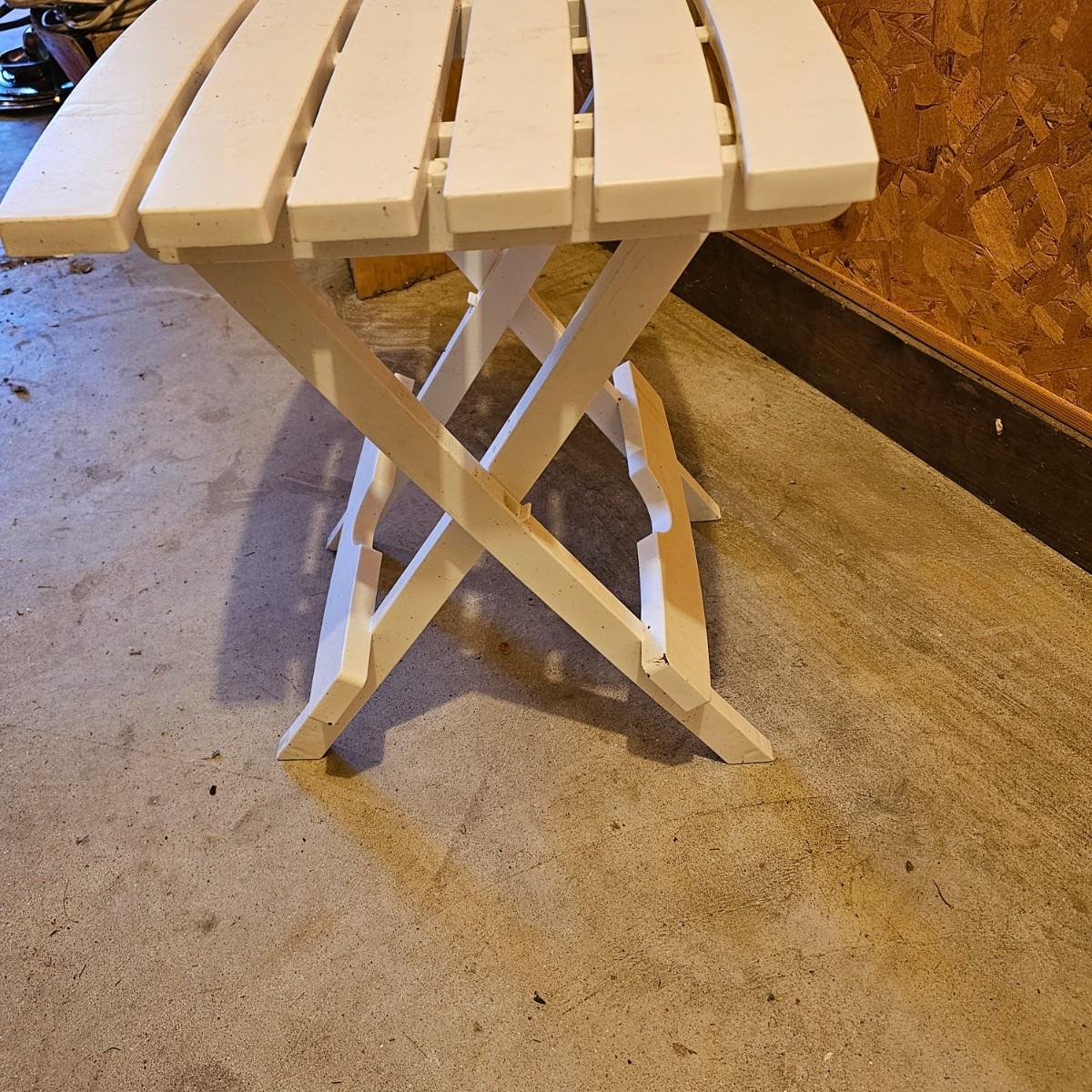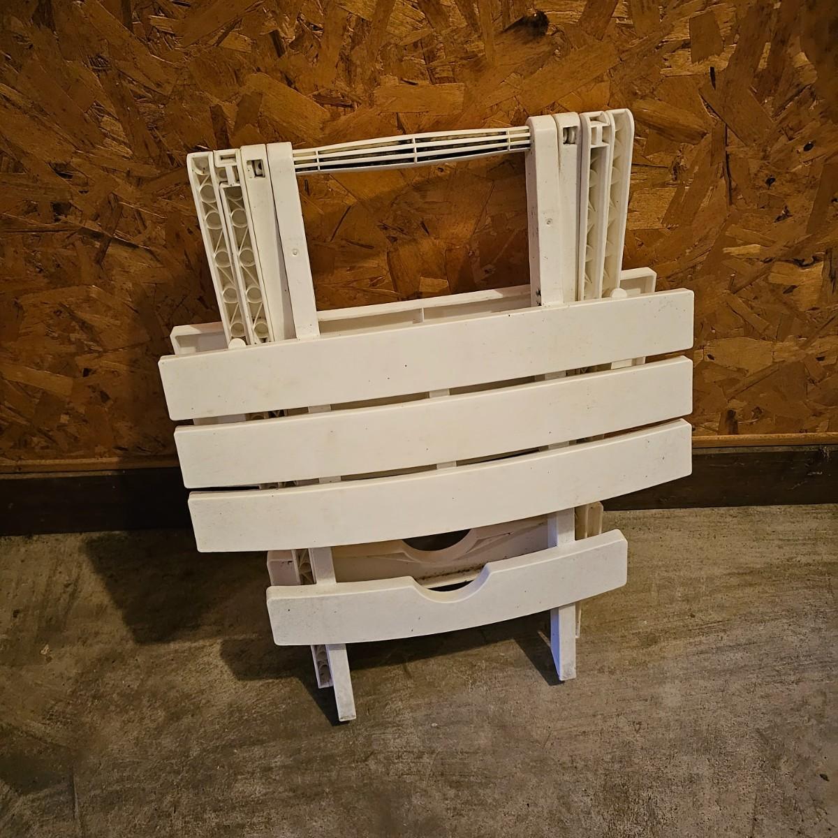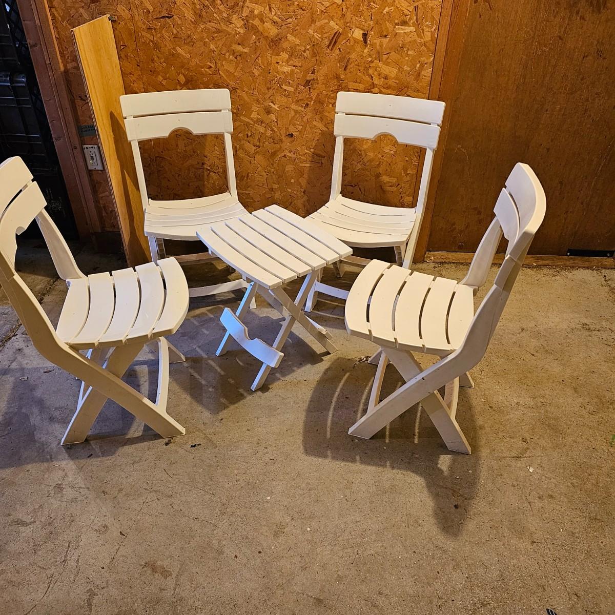 A set of four plastic chairs and one small table. All items fold up for easy storage. Chairs are 16" x 19" x 32"H with a 26" seat height. Table is 15" x 17" x 20"H. See photos for details. Local pickup only.