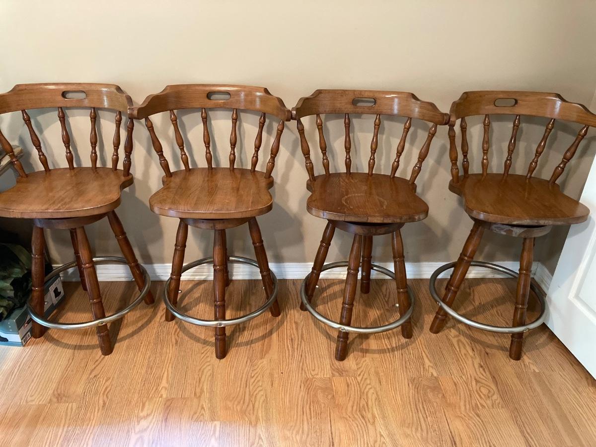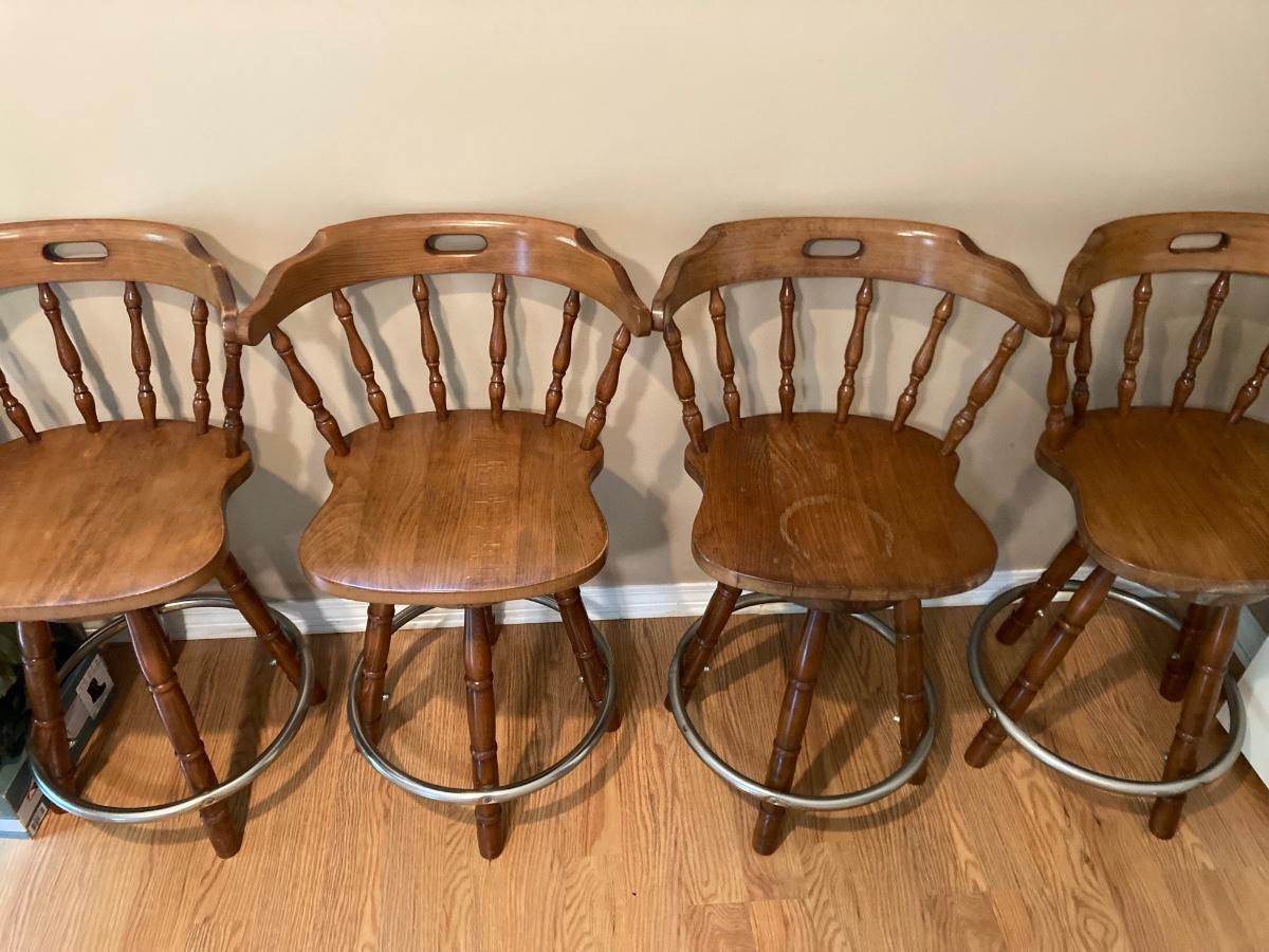 4 wooden swivel barstools. 38” tall. 25” h to seat, 15” across