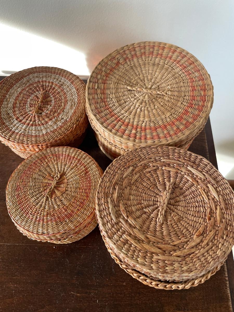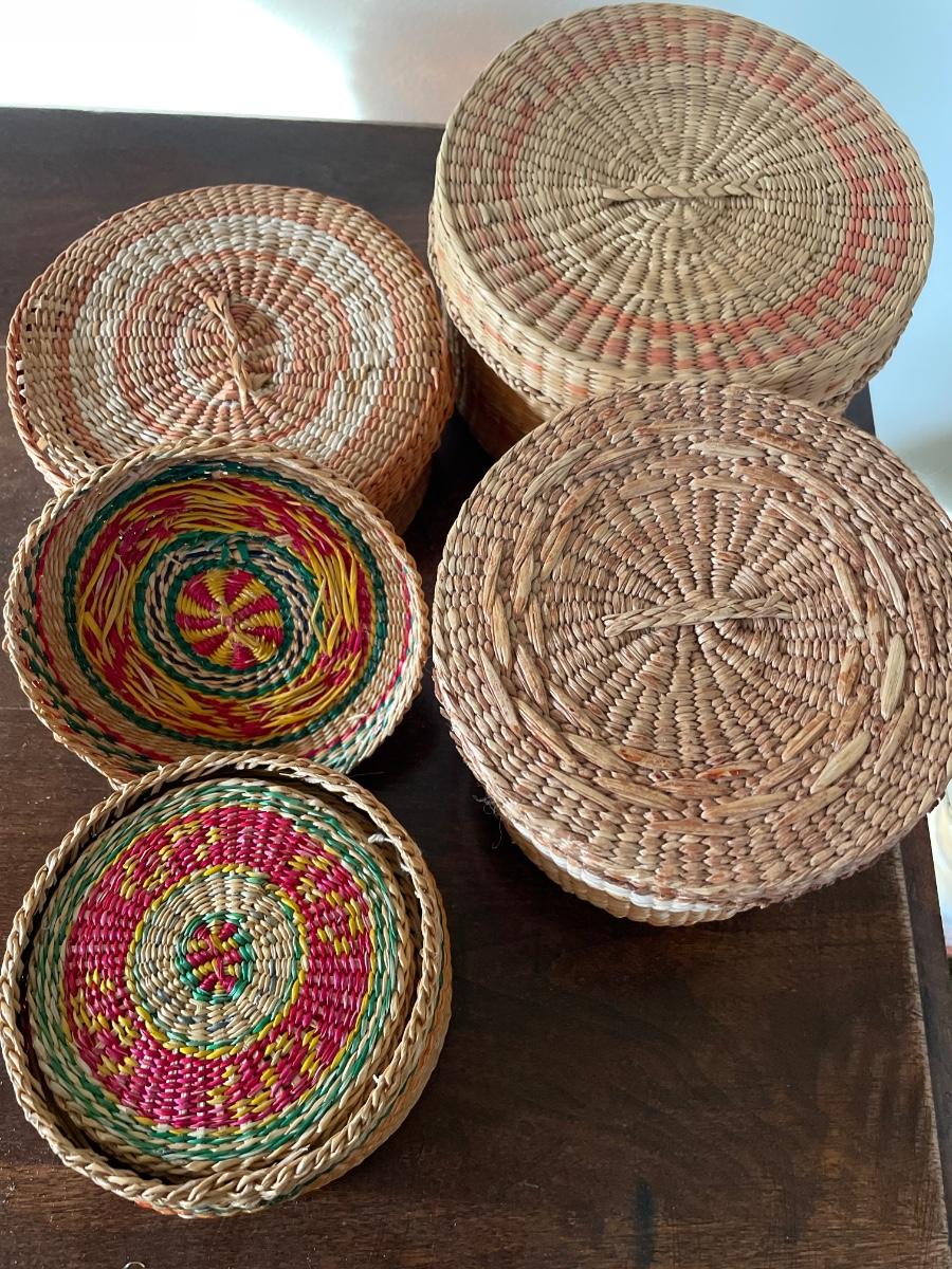 4 woven baskets with coasters