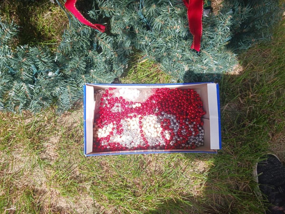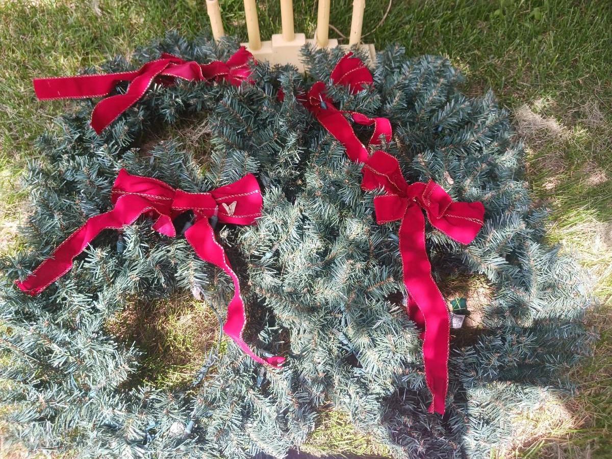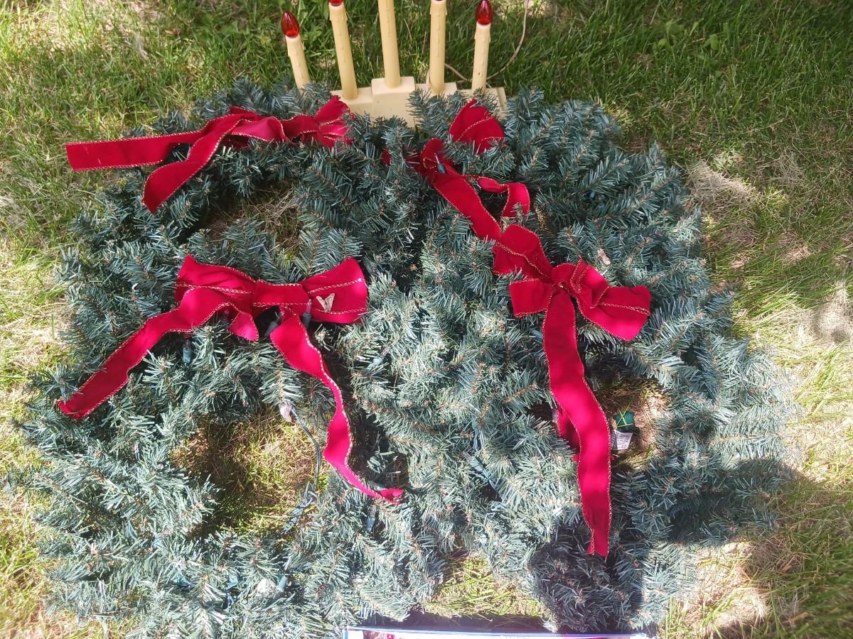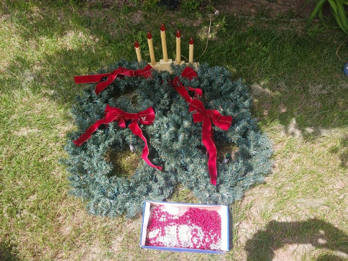 4 WREATHS, BEADED GARLAND AND LIGHTED WINDOW CANDLES
