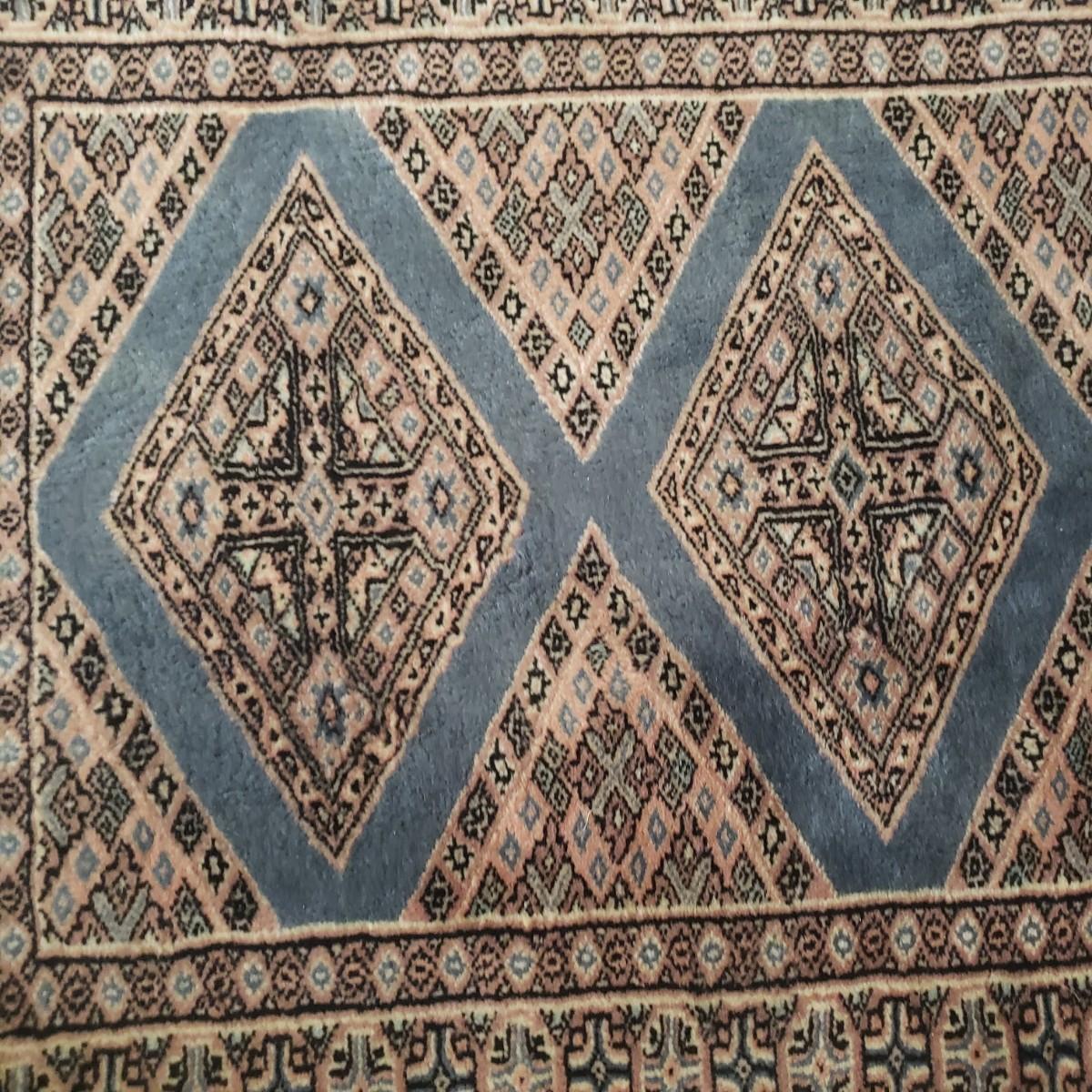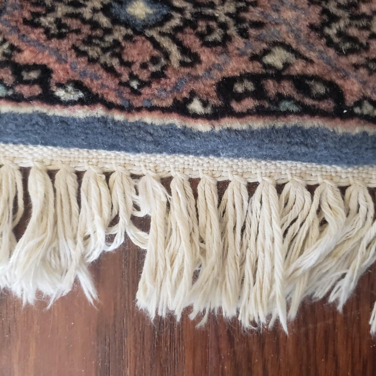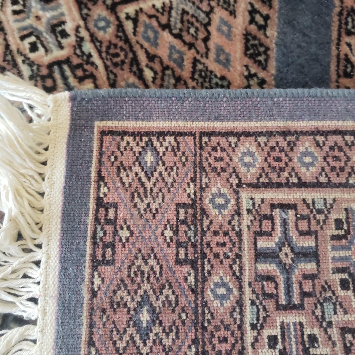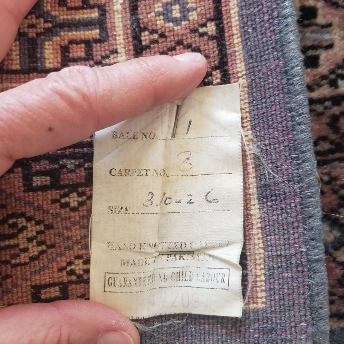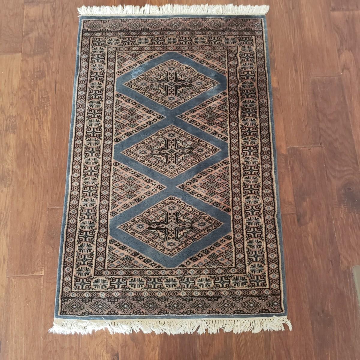 This small area rug is in blues, black and rose colors. It measures 2'6" x 4'H. The tag says hand knotted in Pakistan. Per the homeowner, it was purchased from Marshal Fields in 2001. Please see photos for details.