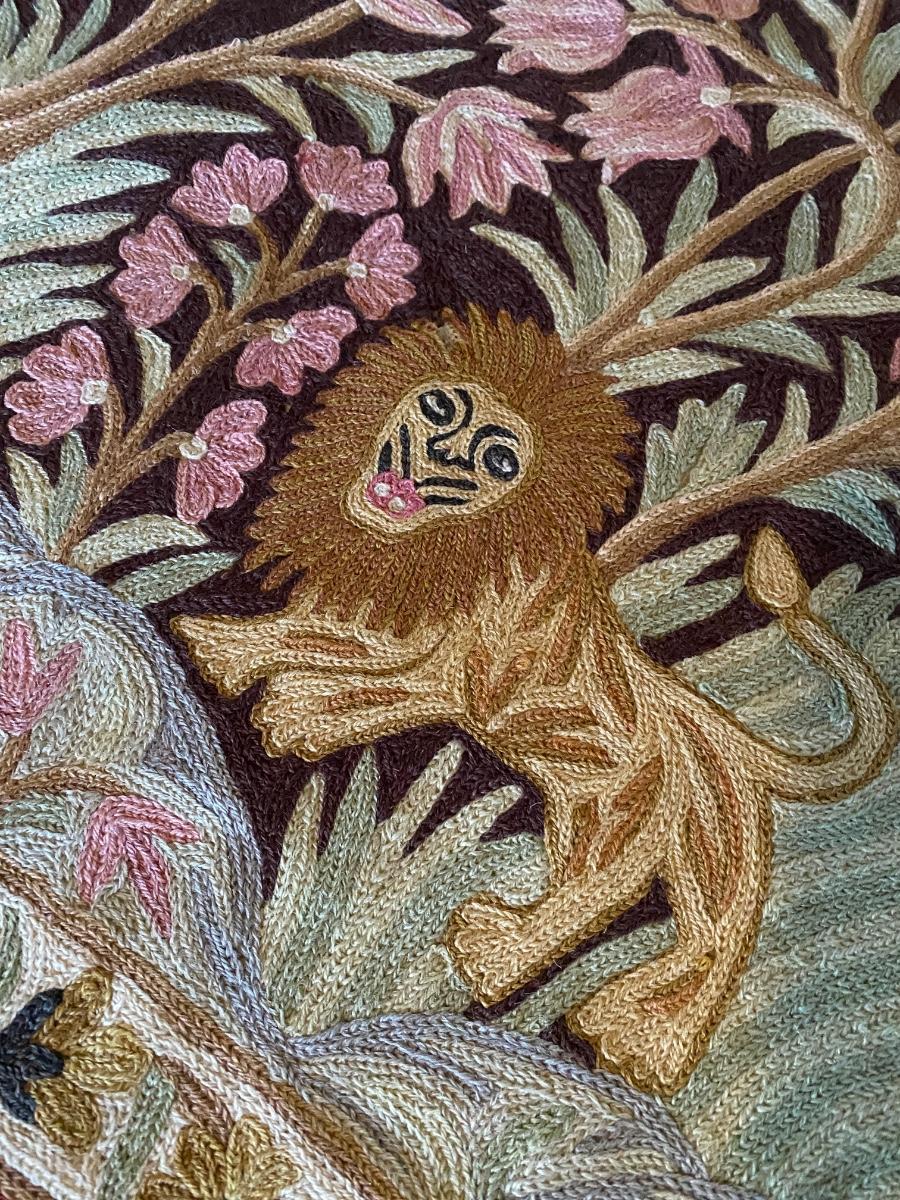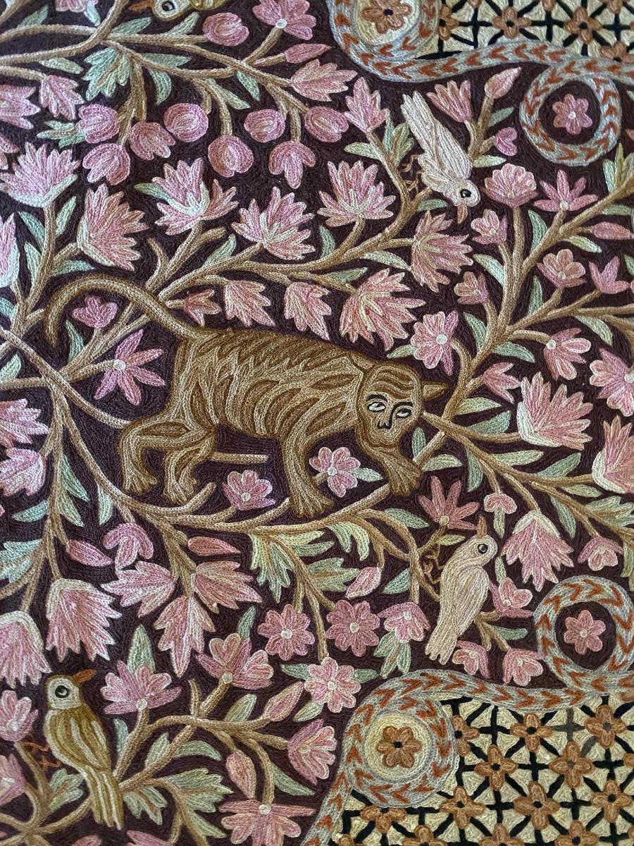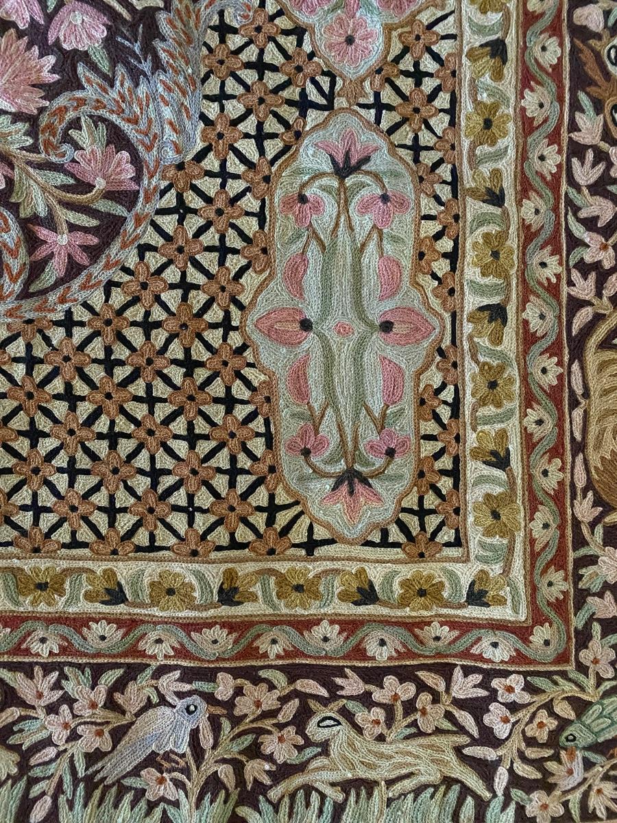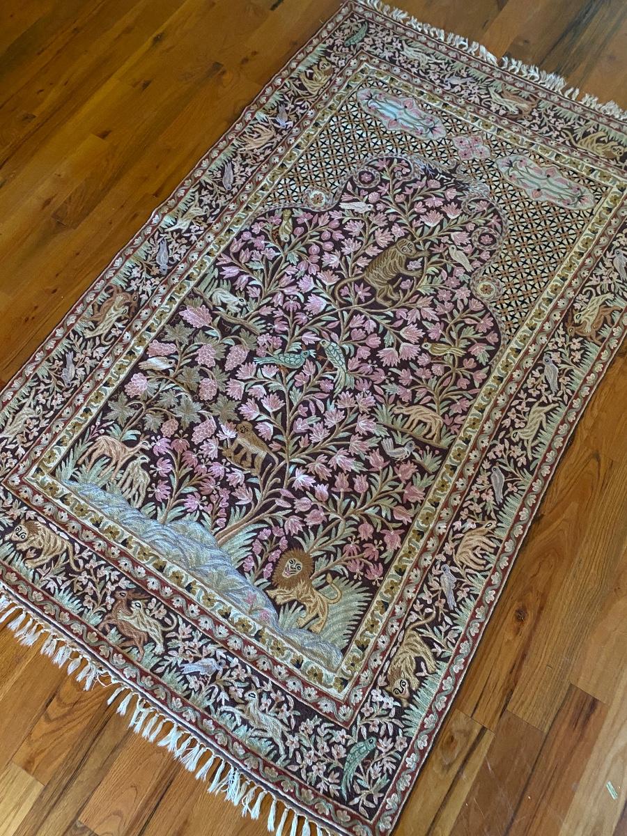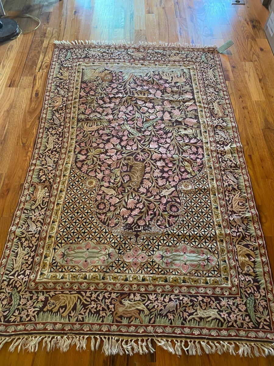 Adorable embroidery rug with animals woven in and backing. Great for kids room or somewhere you need to brighten things up. Bright pinks, blues and tan colors and measures 4’ x 6’. Was recently cleaned at laundromat. Shipping available