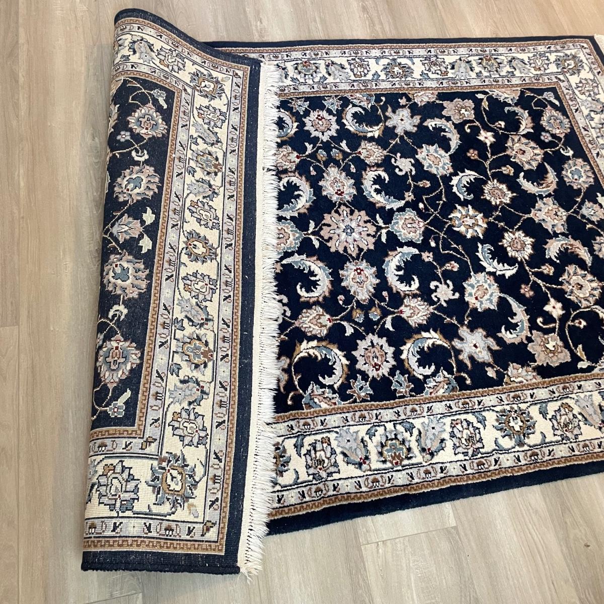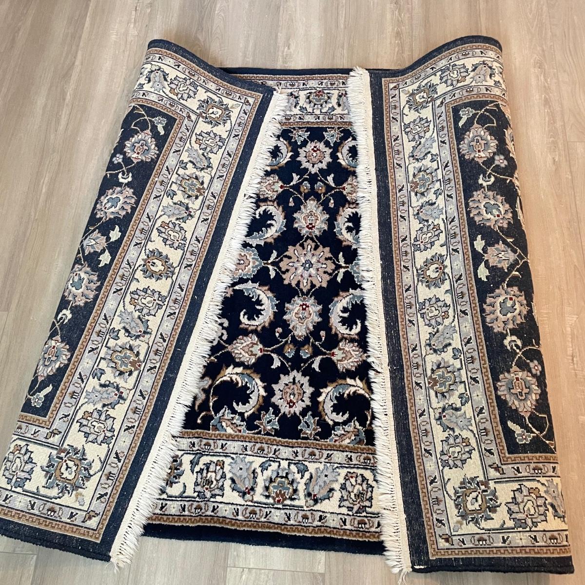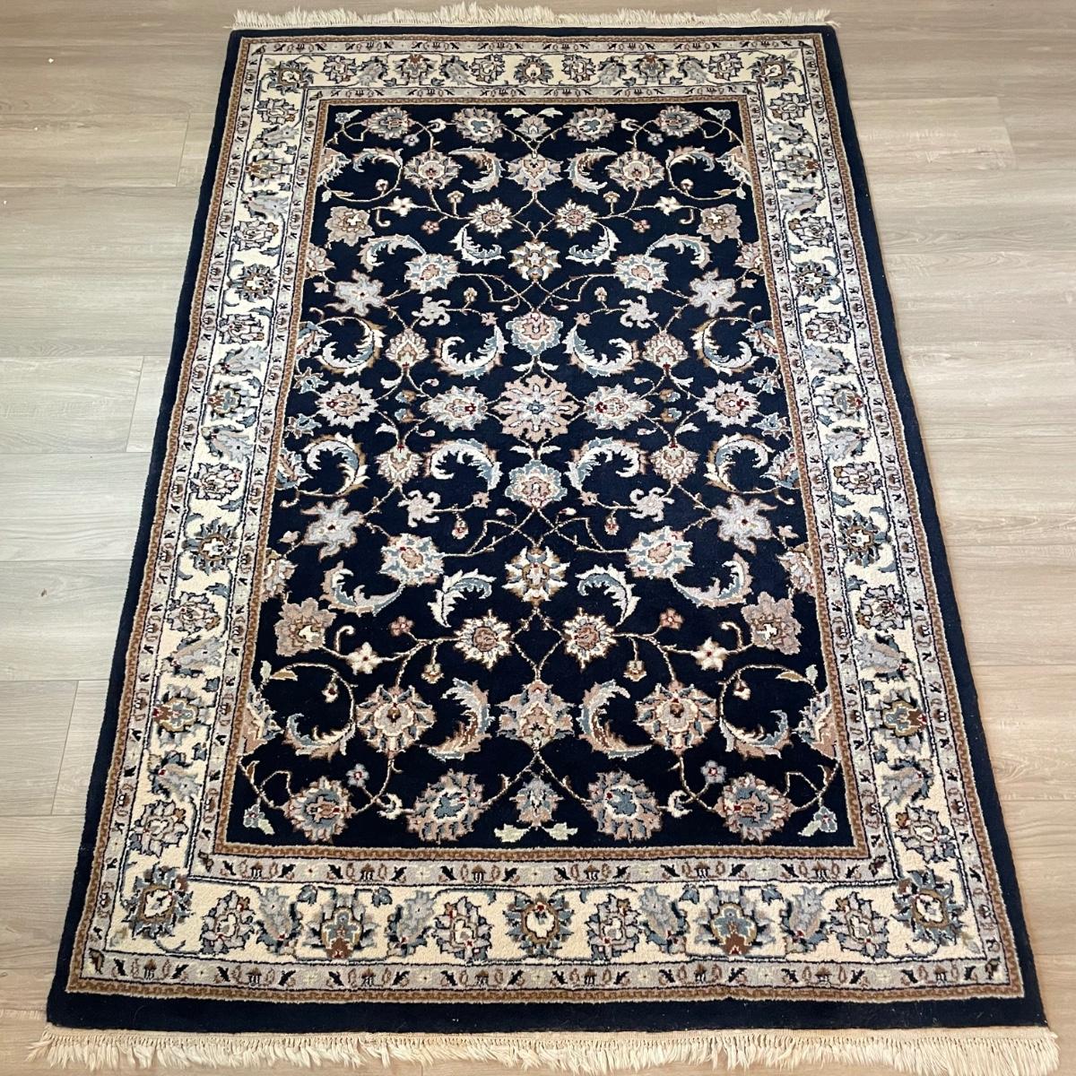 Nice sized dark and elegant area rug. The rug is a very dark navy, almost black, with a plethora of colors throughout its detailed pattern. Rug measures 6’3” x 4’1.5” before the fringe, it has some white pet hair on it. No known manufacturer label. See images. Local pick up.