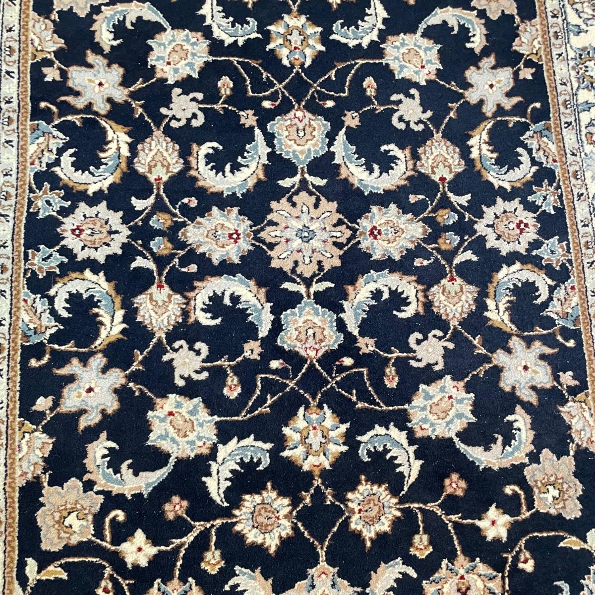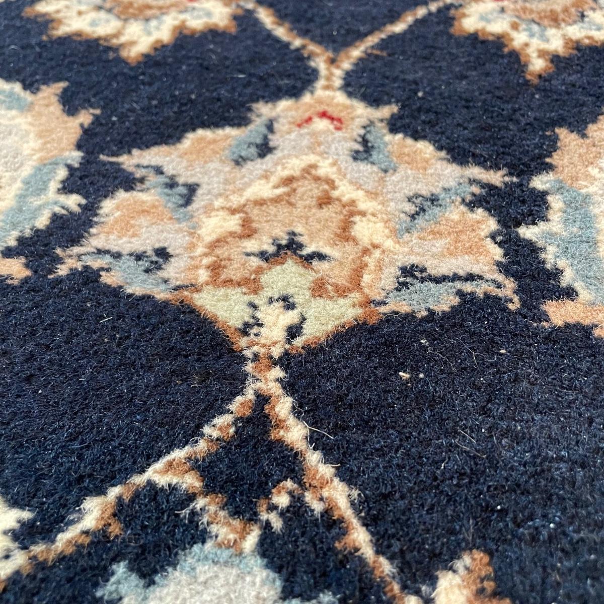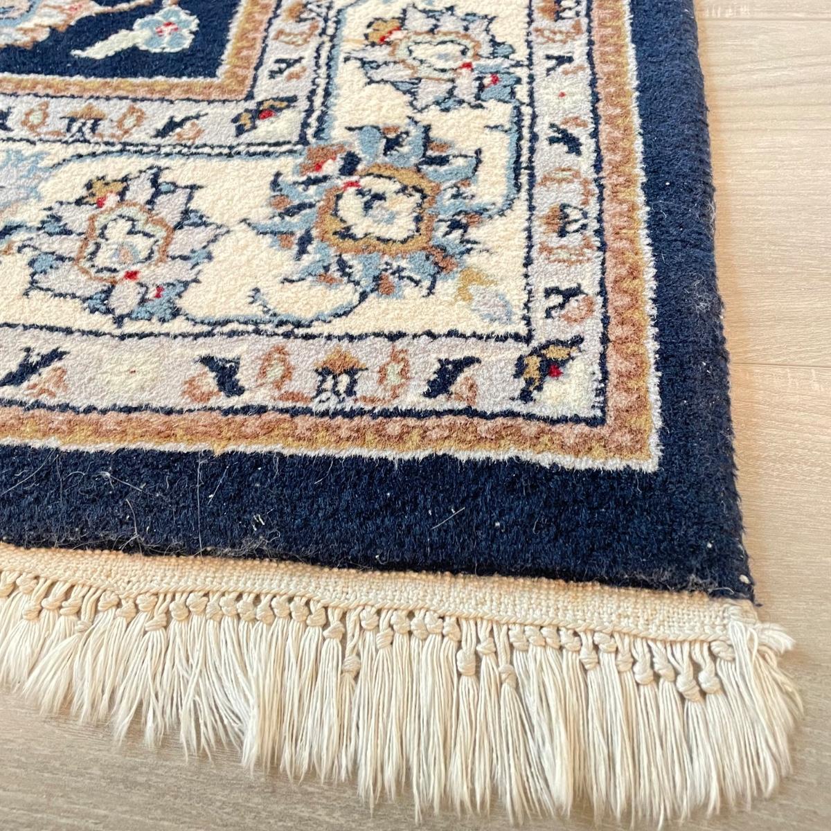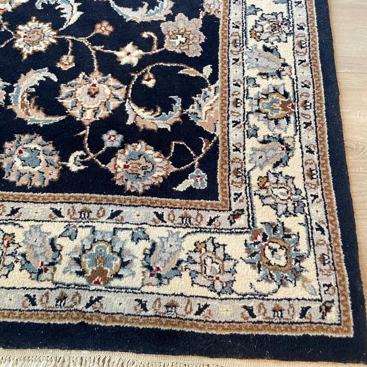 Nice sized dark and elegant area rug. The rug is a very dark navy, almost black, with a plethora of colors throughout its detailed pattern. Rug measures 6’3” x 4’1.5” before the fringe, it has some white pet hair on it. No known manufacturer label. See images. Local pick up.