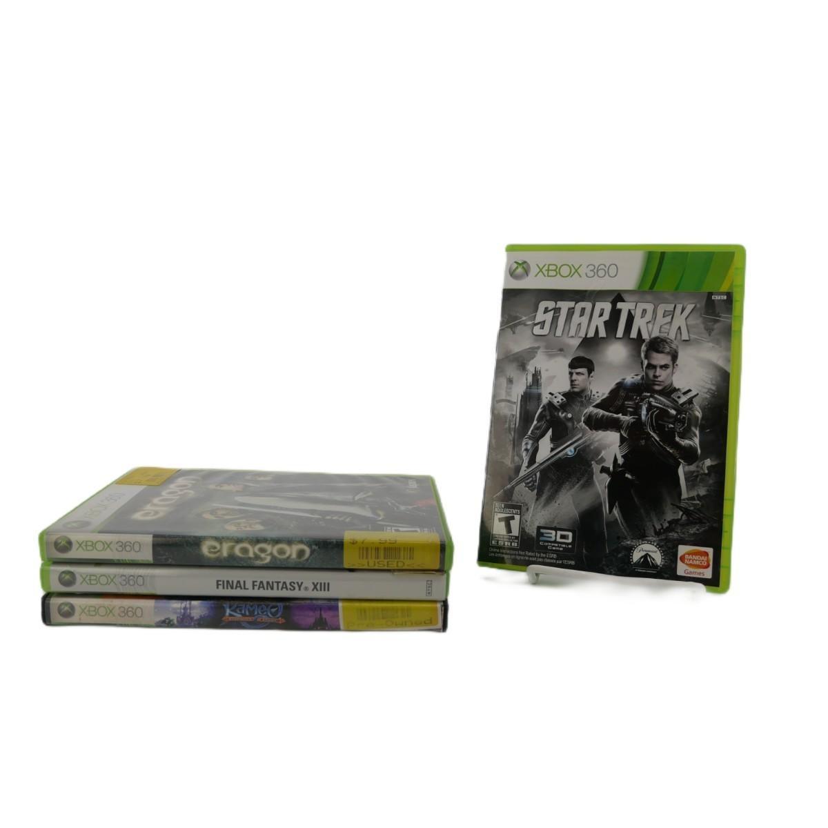 Lot of 4 Xbox 360 games including: Star Trek, Eragon, Final Fantasy XIII, and Kameo Elements of Power. Untested, some boxes have rips and damage. Scratching may be present on discs. Packaged lot measures 6" x 9" x 3", weighs 2 lbs. (M57)