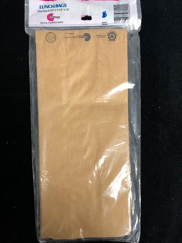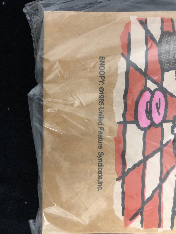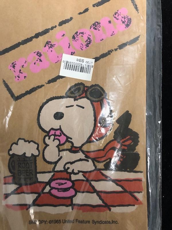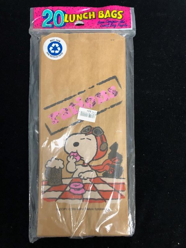 Vintage unopened condition 20 lunch bags made from recycled paper 1965 united feature syndicate. Image of Snoopy eating donuts and drinking root beer stamped "rations"
