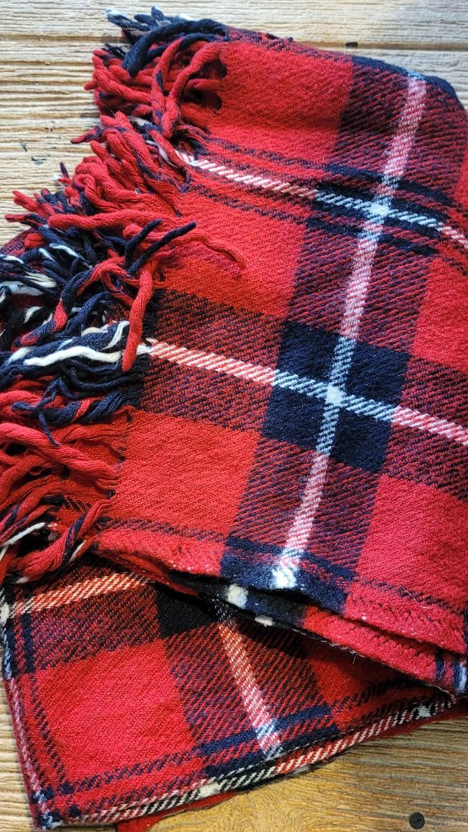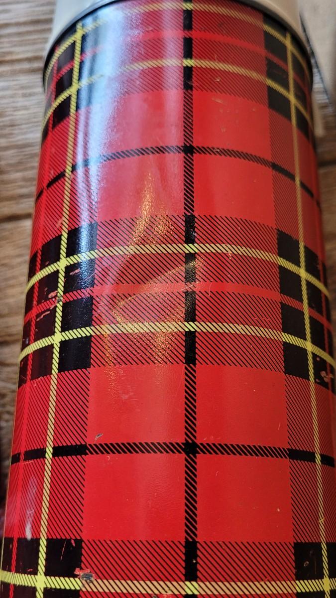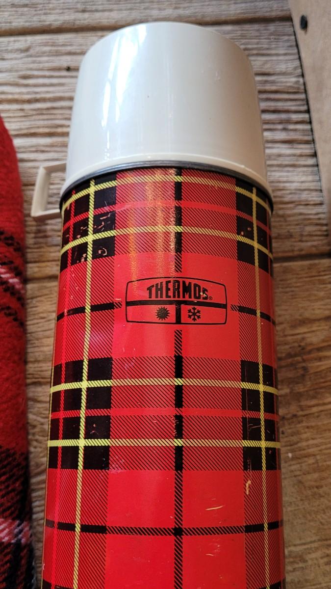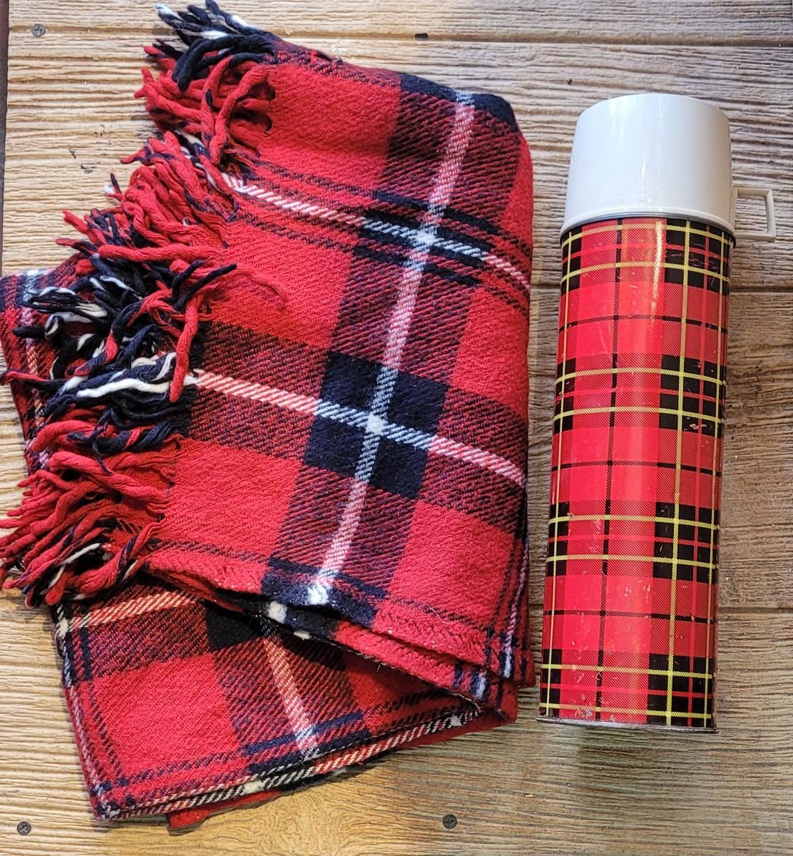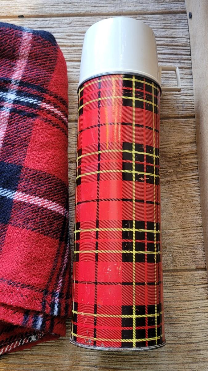 40: Vintage Red & Black Plaid Wool Blanket & Thermos