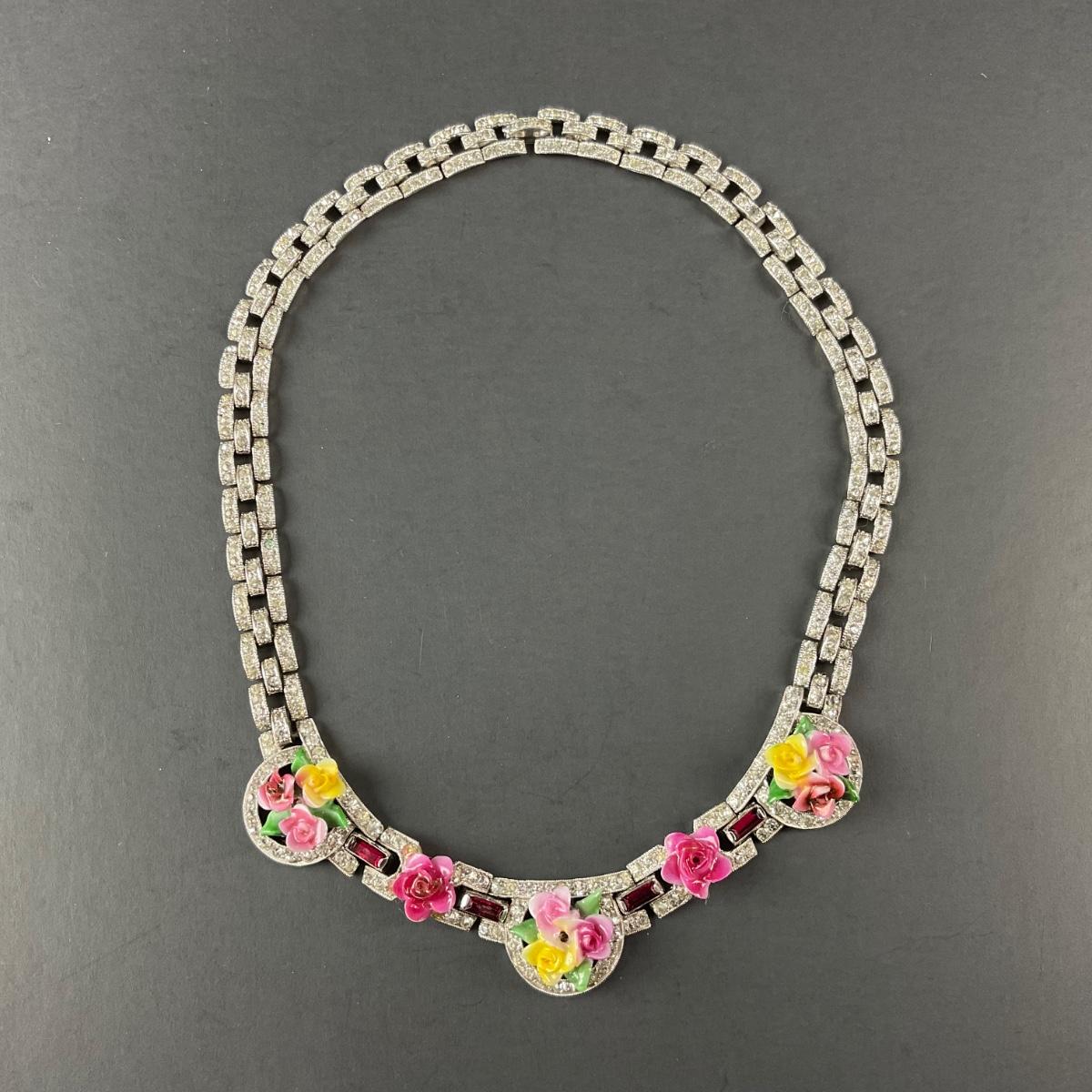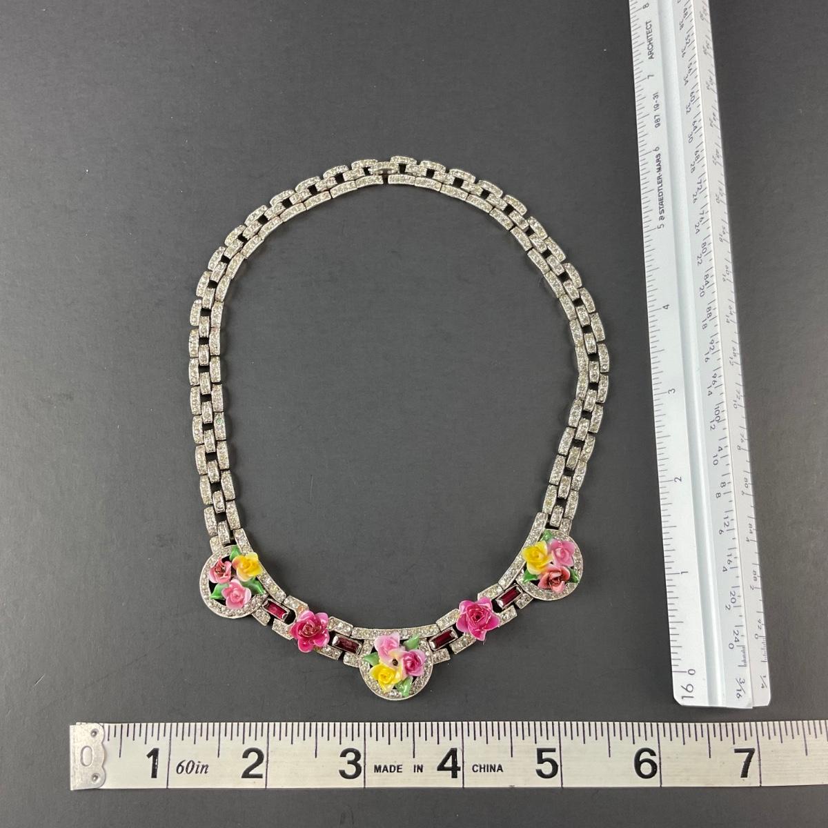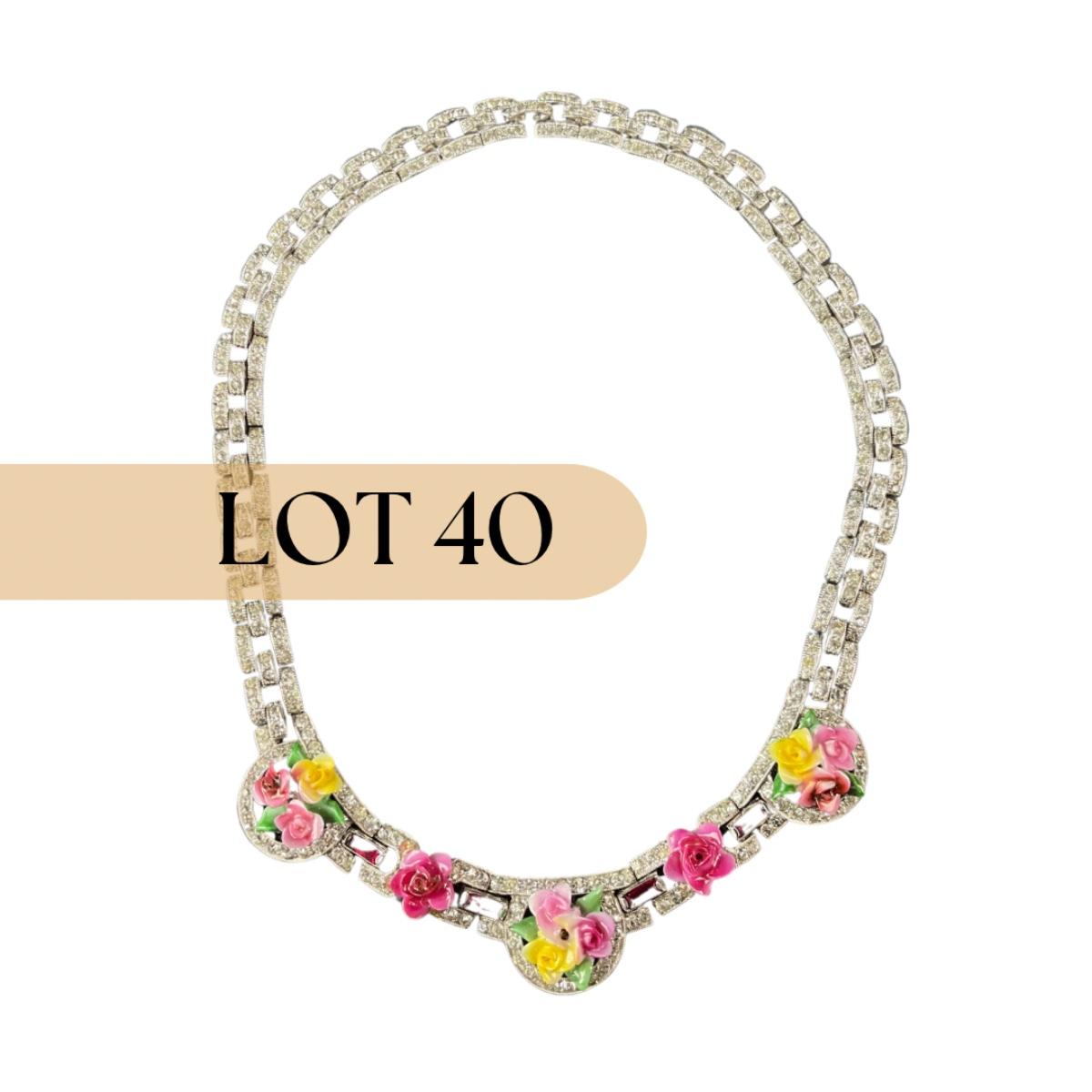 One vintage 1940’s Derosa rare porcelain flower necklace rhodium plated setting with pave clear rhinestones and delicate porcelain roses. This piece has no damage, and appears to be in great shape with no visable chips, cracks, or broken pieces. Please see photos for details and condition. Any condition statement is given as a courtesy to a client, is an opinion, and should not be treated as a statement of fact. Reference to condition written, oral or within a condition report shall not be regarded as a full account of condition and may not include all defects, alterations, or restorations. Absence of a condition report does not imply a lot is flawless or lacking imperfections or damage. Katherine’s Auction & Appraisal Service shall have no responsibility for any error or omission. Returns shall not be accepted on the basis of condition. ::: Shipping is available on this lot. If you require shipping you must let us know at the close of the auction. We will coordinate with you after the item has been won. Shipping fees will include insurance up to or exceeding the value of all items being mailed. If you have any questions regarding this lot please contact the auctioneer either via this website, by direct email or by phone. PICK UP TIMES and other important information can be found in the TERMS and DESCRIPTION of the auction. Please take a look for pertinent information. Thanks!