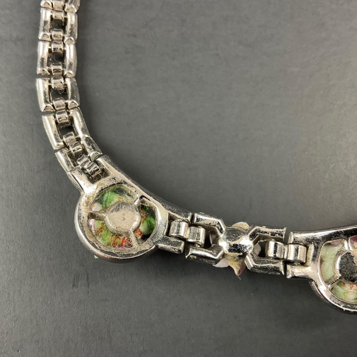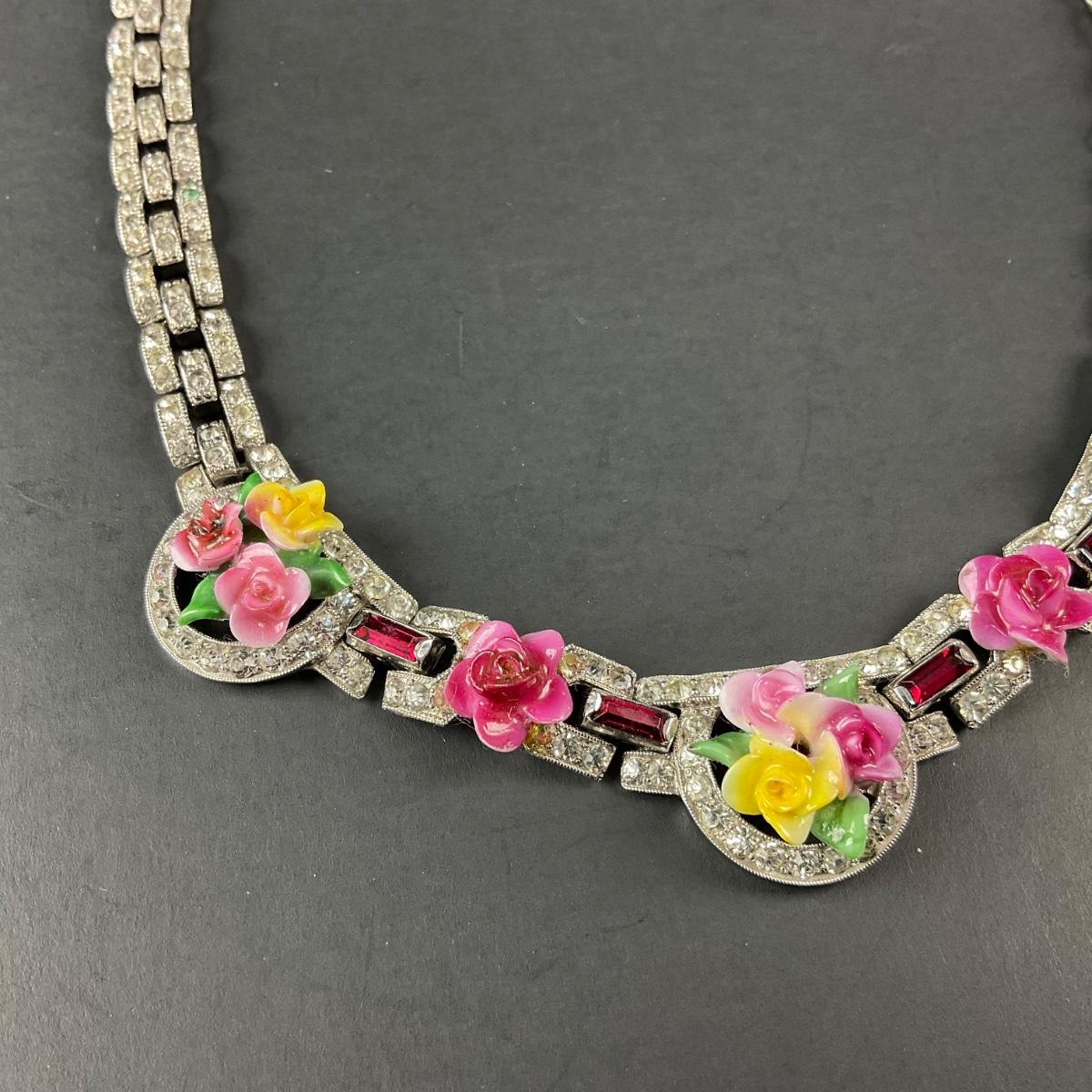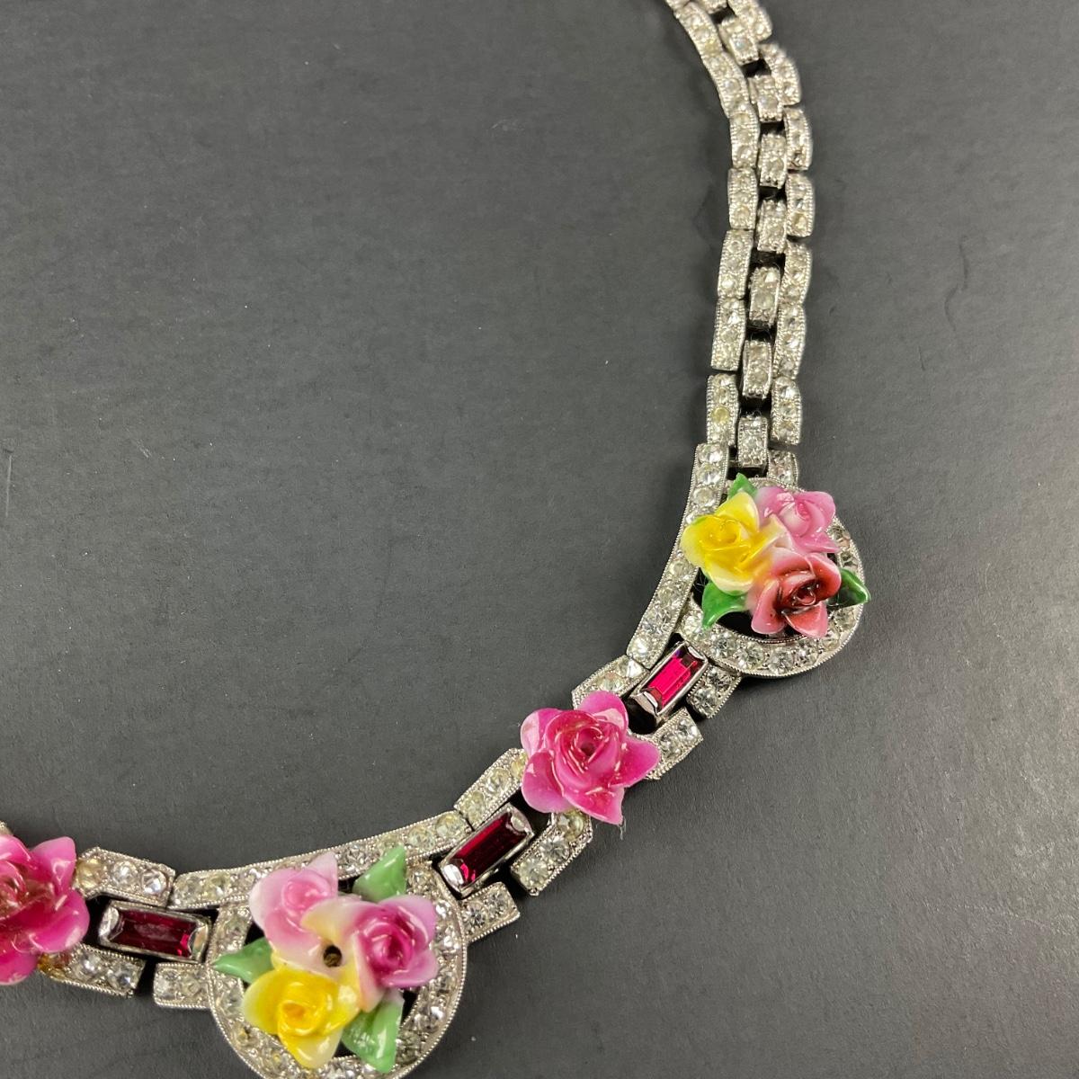 One vintage 1940’s Derosa rare porcelain flower necklace rhodium plated setting with pave clear rhinestones and delicate porcelain roses. This piece has no damage, and appears to be in great shape with no visable chips, cracks, or broken pieces. Please see photos for details and condition. Any condition statement is given as a courtesy to a client, is an opinion, and should not be treated as a statement of fact. Reference to condition written, oral or within a condition report shall not be regarded as a full account of condition and may not include all defects, alterations, or restorations. Absence of a condition report does not imply a lot is flawless or lacking imperfections or damage. Katherine’s Auction & Appraisal Service shall have no responsibility for any error or omission. Returns shall not be accepted on the basis of condition. ::: Shipping is available on this lot. If you require shipping you must let us know at the close of the auction. We will coordinate with you after the item has been won. Shipping fees will include insurance up to or exceeding the value of all items being mailed. If you have any questions regarding this lot please contact the auctioneer either via this website, by direct email or by phone. PICK UP TIMES and other important information can be found in the TERMS and DESCRIPTION of the auction. Please take a look for pertinent information. Thanks!