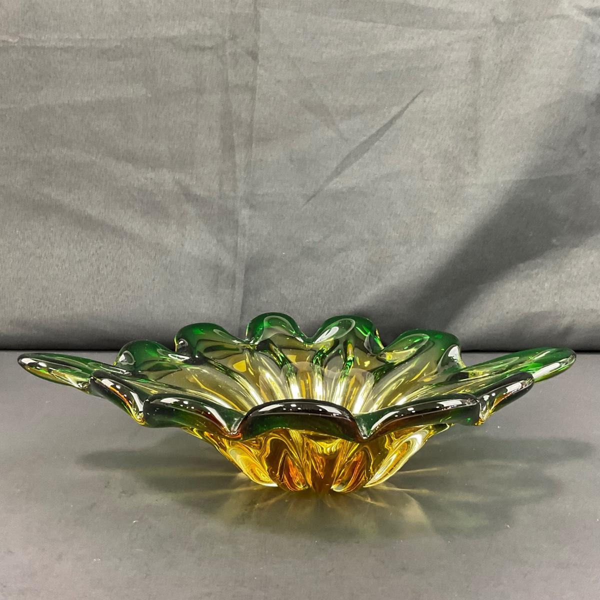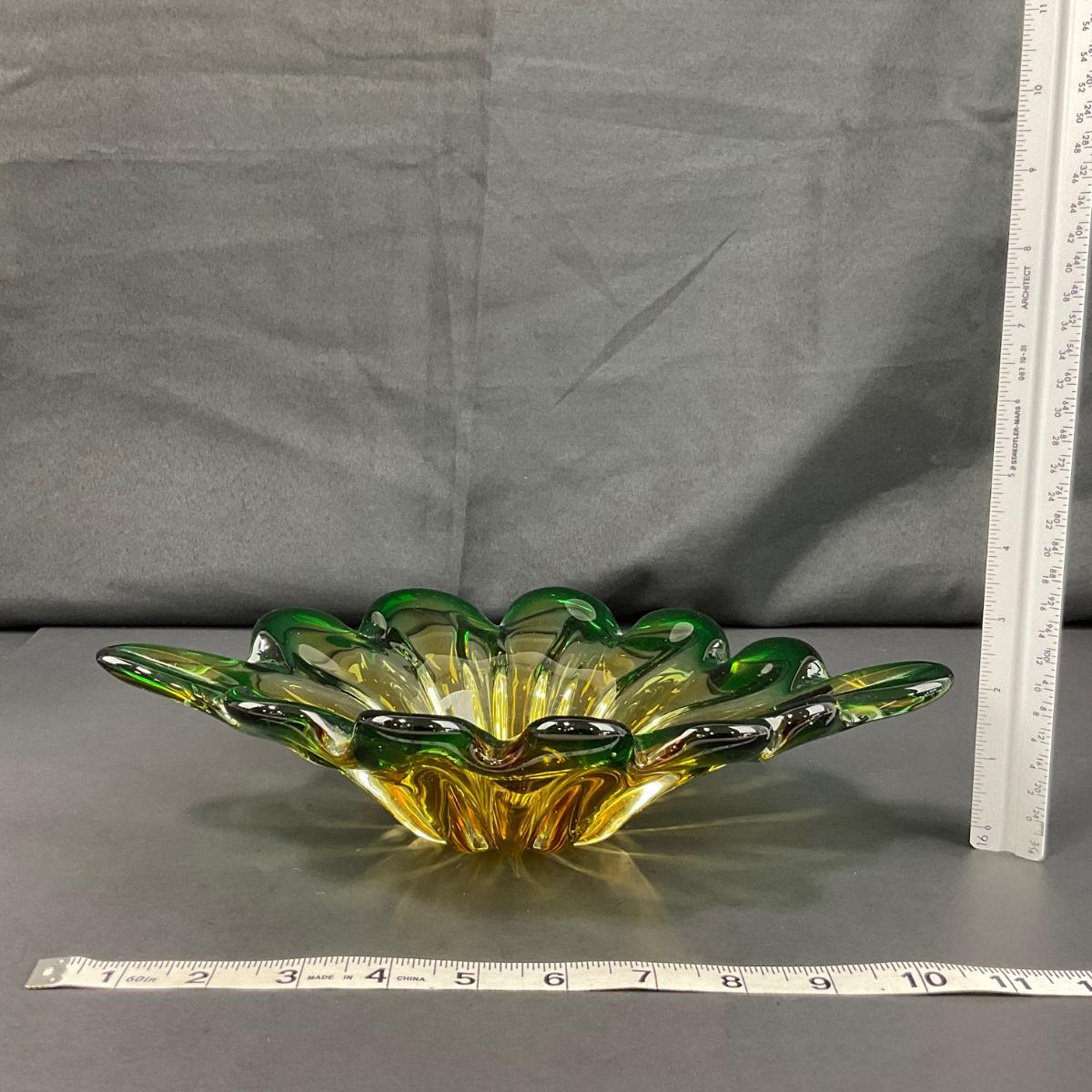 One vintage green and gold Murano heavy dish. This piece does have some scuffs, scratches, marks, or slight damage, but otherwise appears to be in great shape. Please see photos for details and condition. Any condition statement is given as a courtesy to a client, is an opinion, and should not be treated as a statement of fact. Reference to condition written, oral or within a condition report shall not be regarded as a full account of condition and may not include all defects, alterations, or restorations. Absence of a condition report does not imply a lot is flawless or lacking imperfections or damage. Katherine’s Auction & Appraisal Service shall have no responsibility for any error or omission. Returns shall not be accepted on the basis of condition. ::: Shipping is available on this lot. If you require shipping you must let us know at the close of the auction. We will coordinate with you after the item has been won. Shipping fees will include insurance up to or exceeding the value of all items being mailed. If you have any questions regarding this lot please contact the auctioneer either via this website, by direct email or by phone. PICK UP TIMES and other important information can be found in the TERMS and DESCRIPTION of the auction. Please take a look for pertinent information. Thanks!