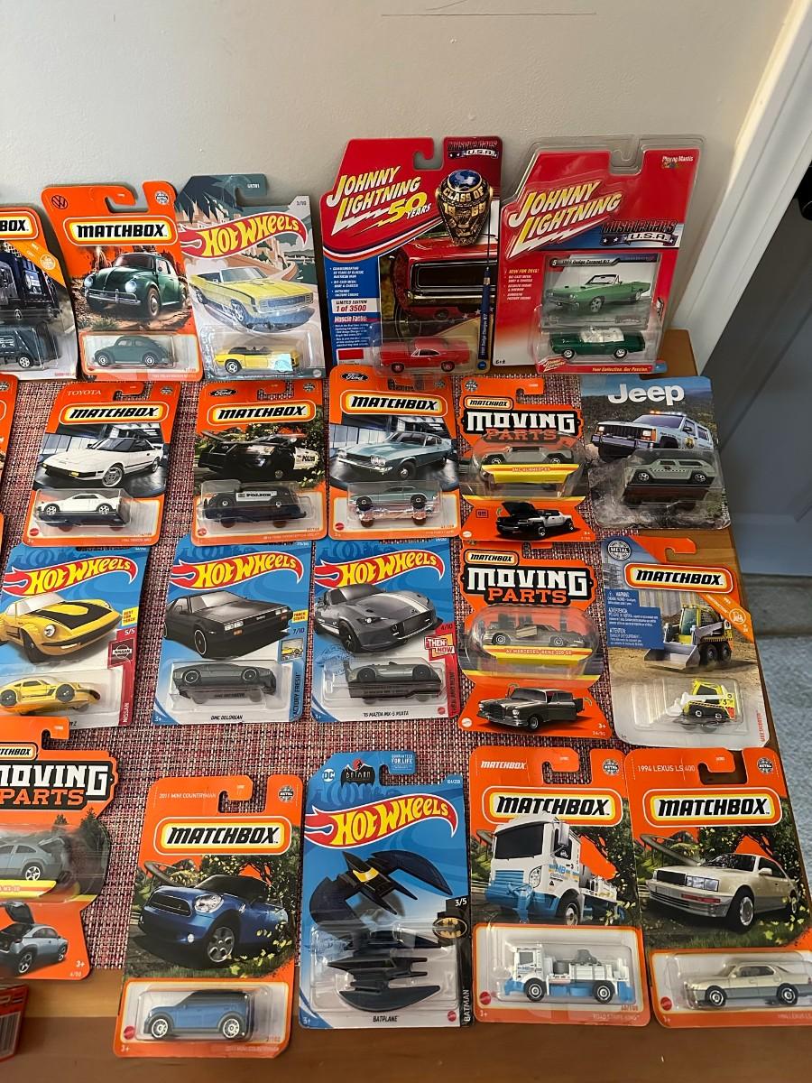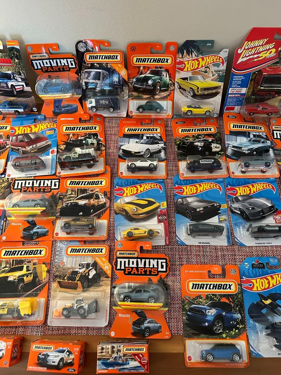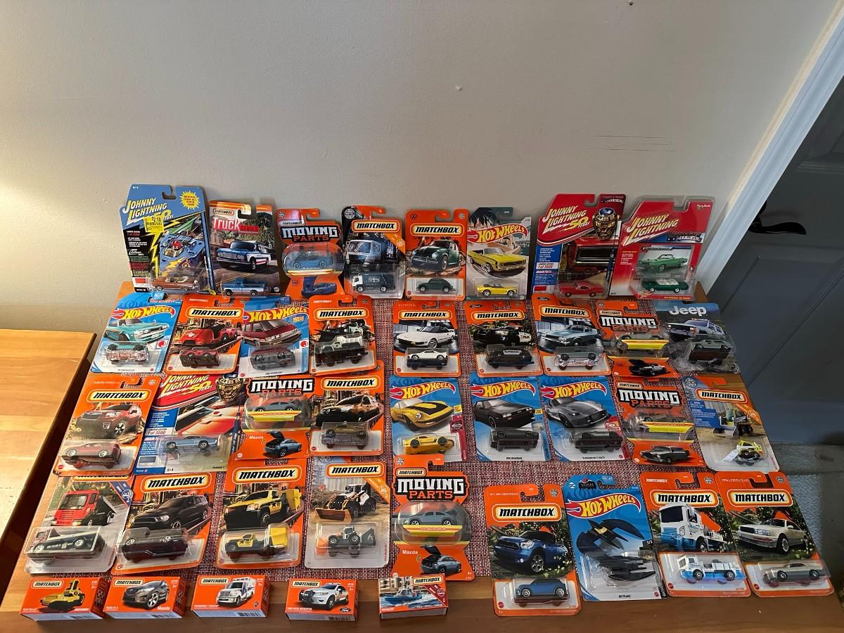 Assorted Hot Wheels, Matchbox, and other toy cars, new in package