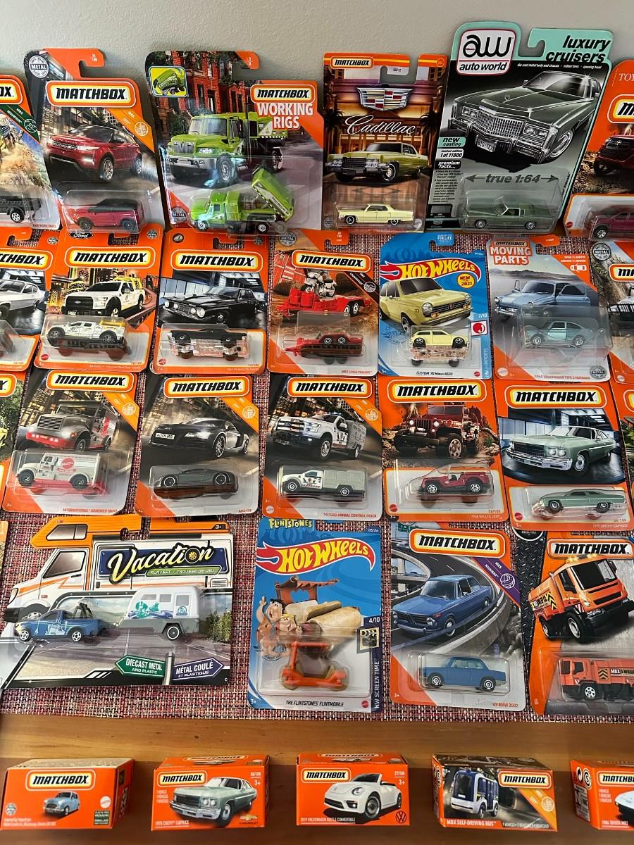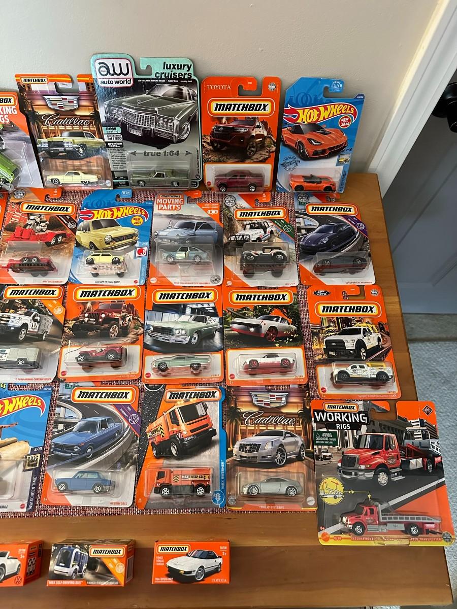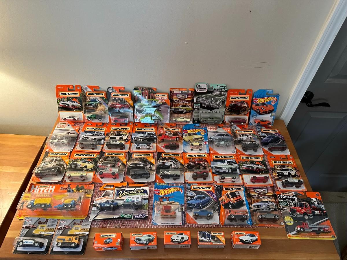 Assorted Hot Wheels, Matchbox, and other toy cars, new in package