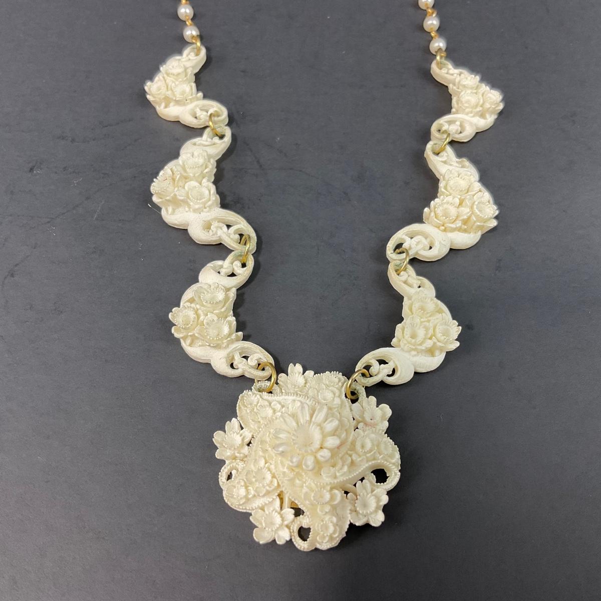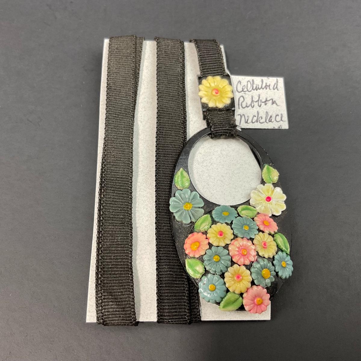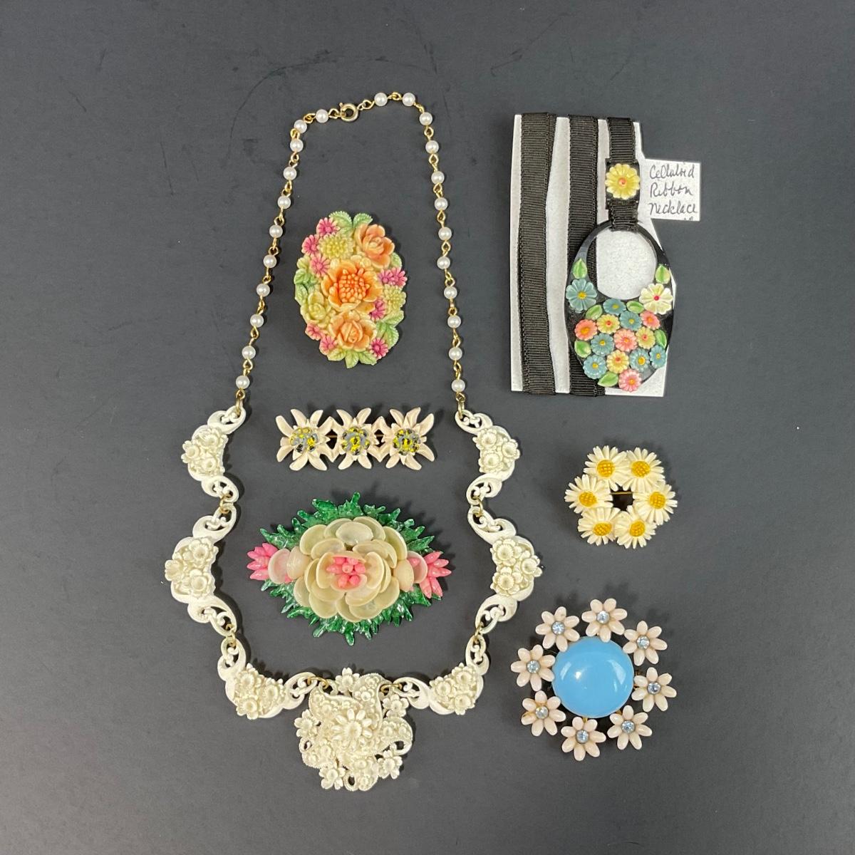 One antique ribbon necklace, one antique Japanese brooch, one celluloid necklace, three vintage celluloid brooches and one shell brooch. This piece does have some scuffs, scratches, marks, or slight damage, but otherwise appears to be in great shape. Please see photos for details and condition. Any condition statement is given as a courtesy to a client, is an opinion, and should not be treated as a statement of fact. Reference to condition written, oral or within a condition report shall not be regarded as a full account of condition and may not include all defects, alterations, or restorations. Absence of a condition report does not imply a lot is flawless or lacking imperfections or damage. Katherine’s Auction & Appraisal Service shall have no responsibility for any error or omission. Returns shall not be accepted on the basis of condition. ::: Shipping is available on this lot. If you require shipping you must let us know at the close of the auction. We will coordinate with you after the item has been won. Shipping fees will include insurance up to or exceeding the value of all items being mailed. If you have any questions regarding this lot please contact the auctioneer either via this website, by direct email or by phone. PICK UP TIMES and other important information can be found in the TERMS and DESCRIPTION of the auction. Please take a look for pertinent information. Thanks!