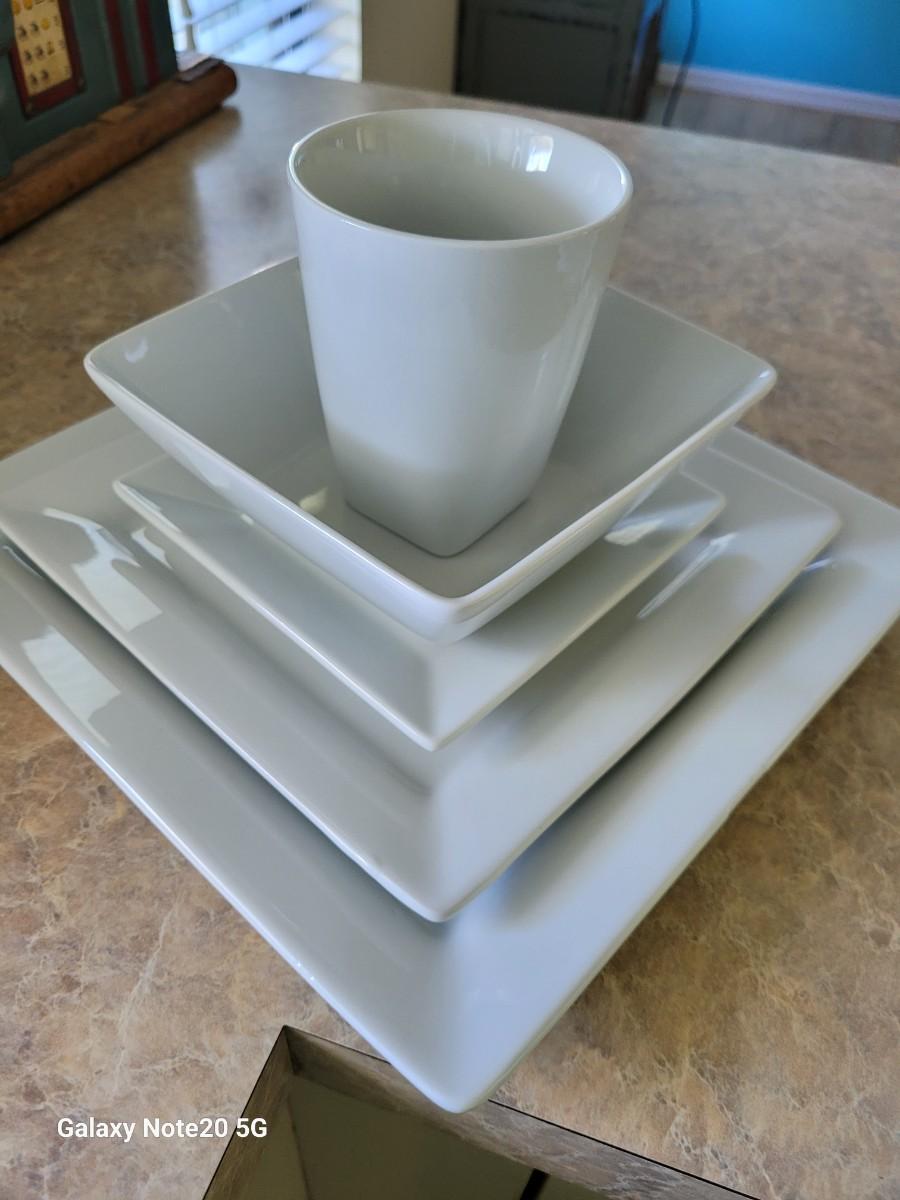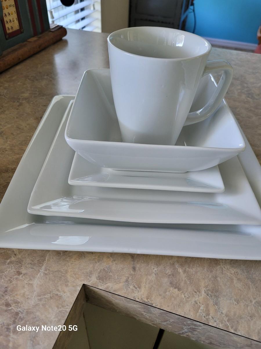 Better Homes & Garden white Square dish set. 8 Dinner, 8 salad plate, 8 bowls, 8 mugs, 8 bread plates. Very clean. No chips
