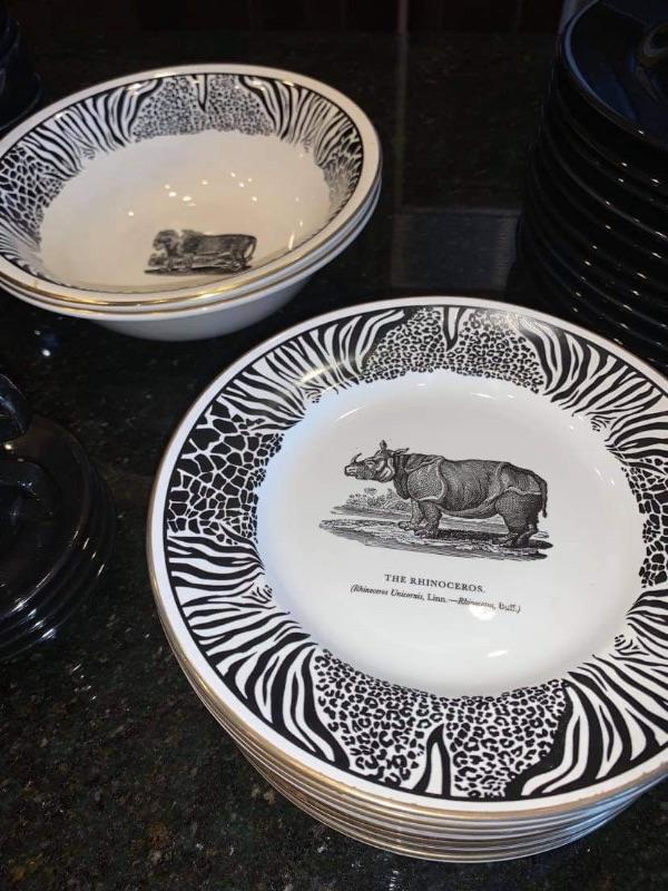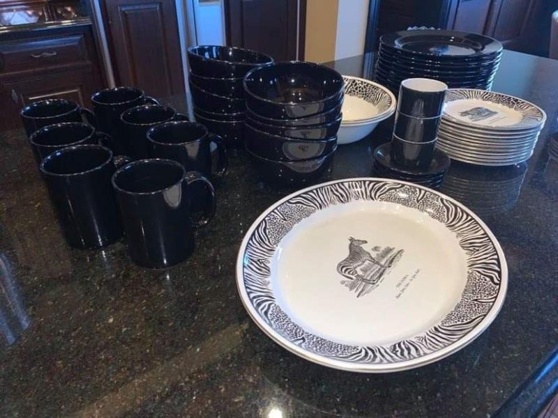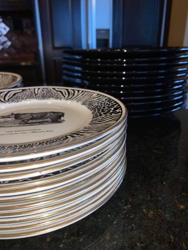 (1) Zebra Platter 14”, (11) Small Plates 8”, (10) Black Plates 10 1â„2 “