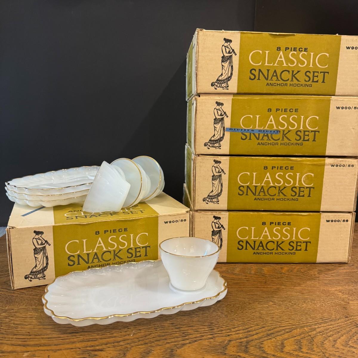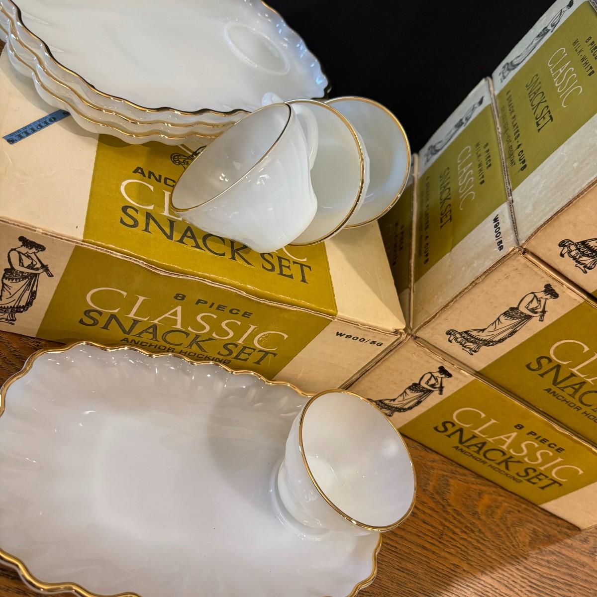 Anchor Hocking 8-piece Gold Edge Milk-White Classic Snack Set W900/56 Circa 1950s