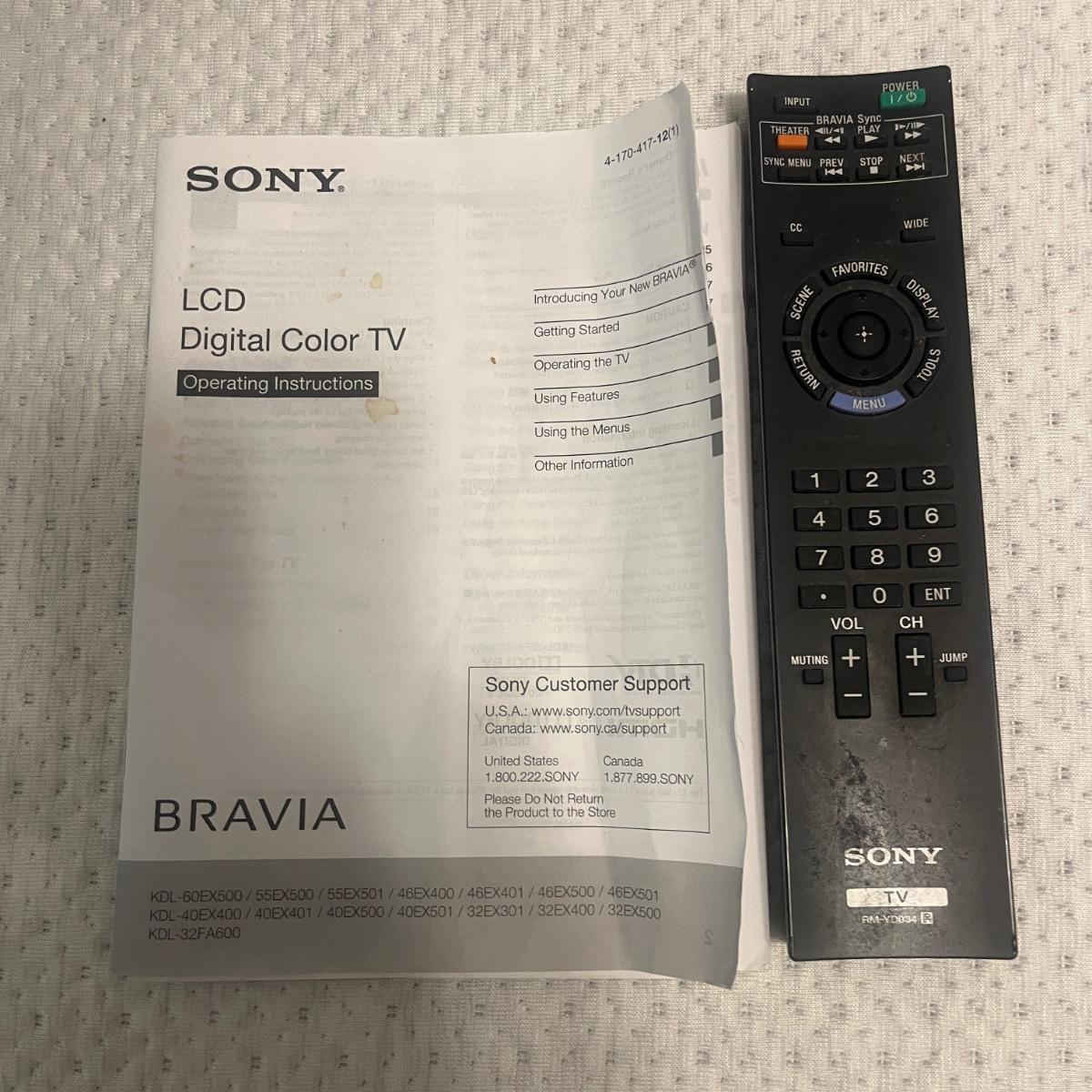 Lot includes a 40” Sony Bravia TV with remote and owner’s manual. TV powered on when plugged in.