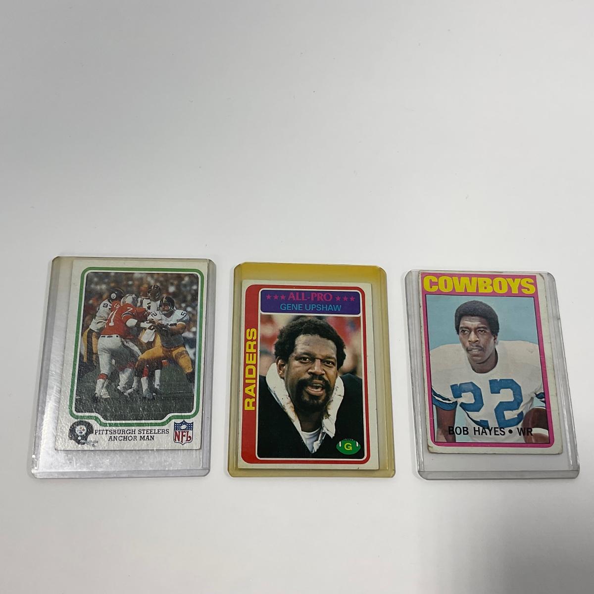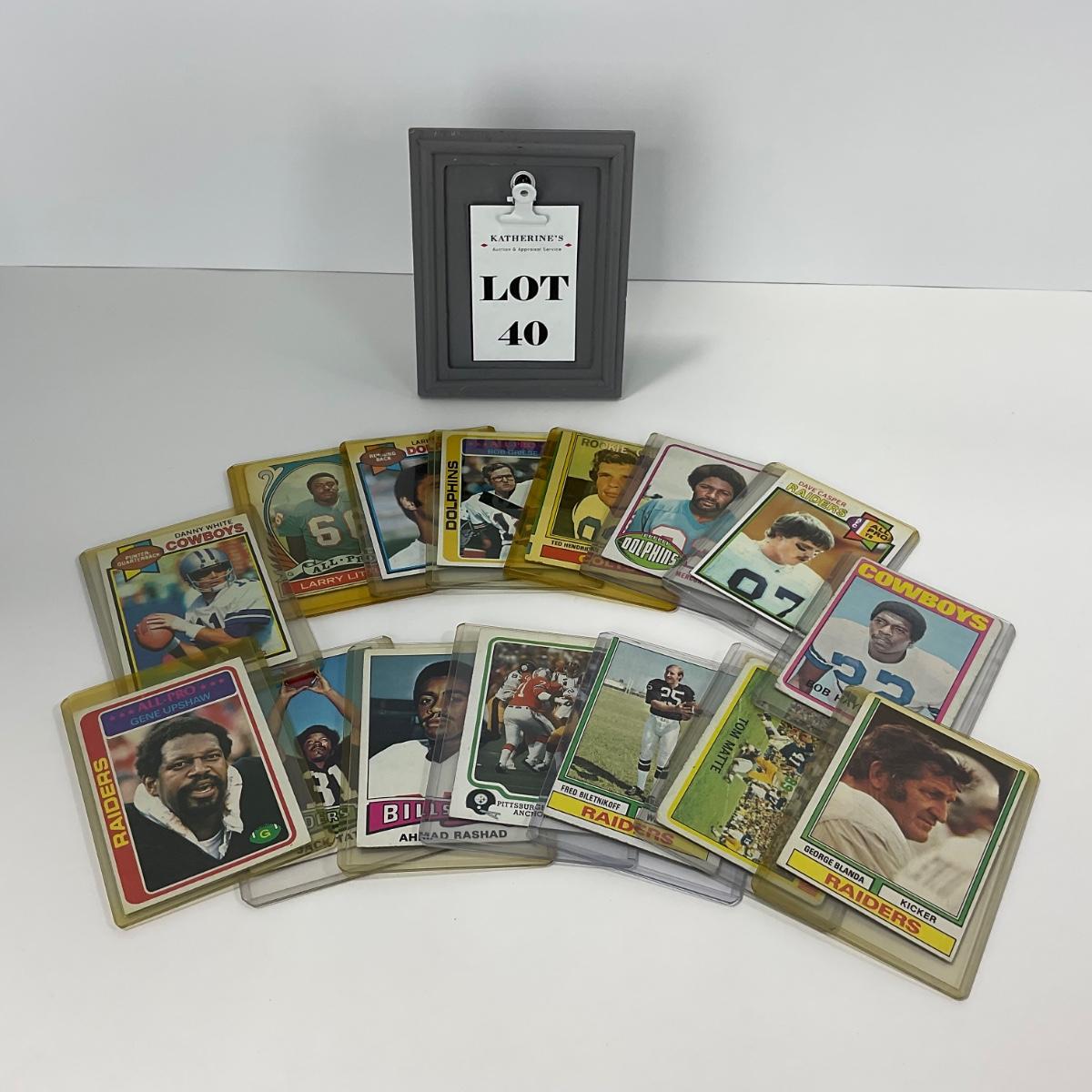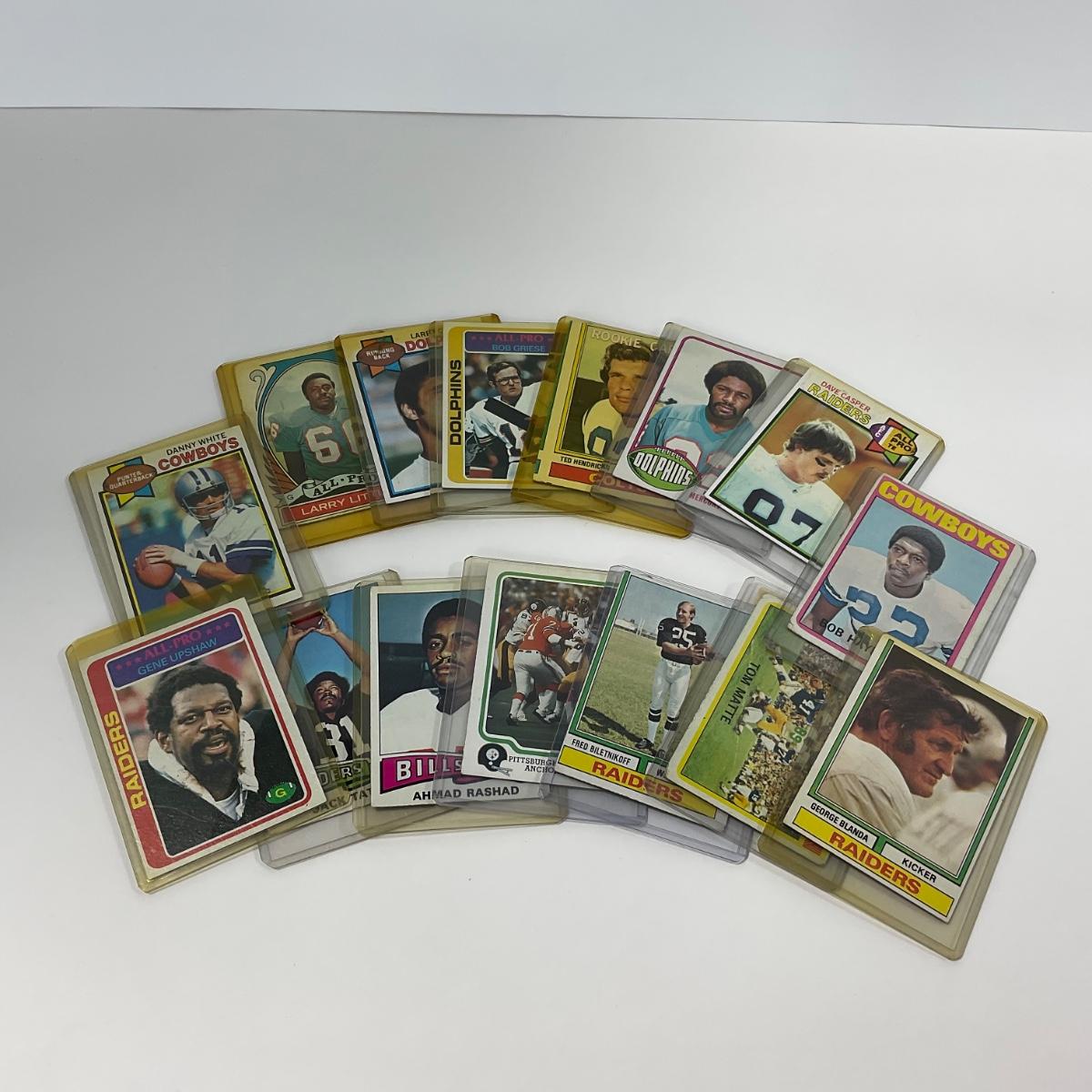 15 vintage 1970’s football stars / hall of famer cards. In plastic sleeves. Please see photos for details and condition. ::: Shipping is available on this lot. If you require shipping you must let us know at the close of the auction. We will coordinate with you after the item has been won. Shipping fees will include insurance up to or exceeding the value of all items being mailed. If you have any questions regarding this lot please contact the auctioneer either via this website, by direct email or by phone. PICK UP TIMES and other important information can be found in the TERMS and DESCRIPTION of the auction. Please take a look for pertinent information. Thanks!