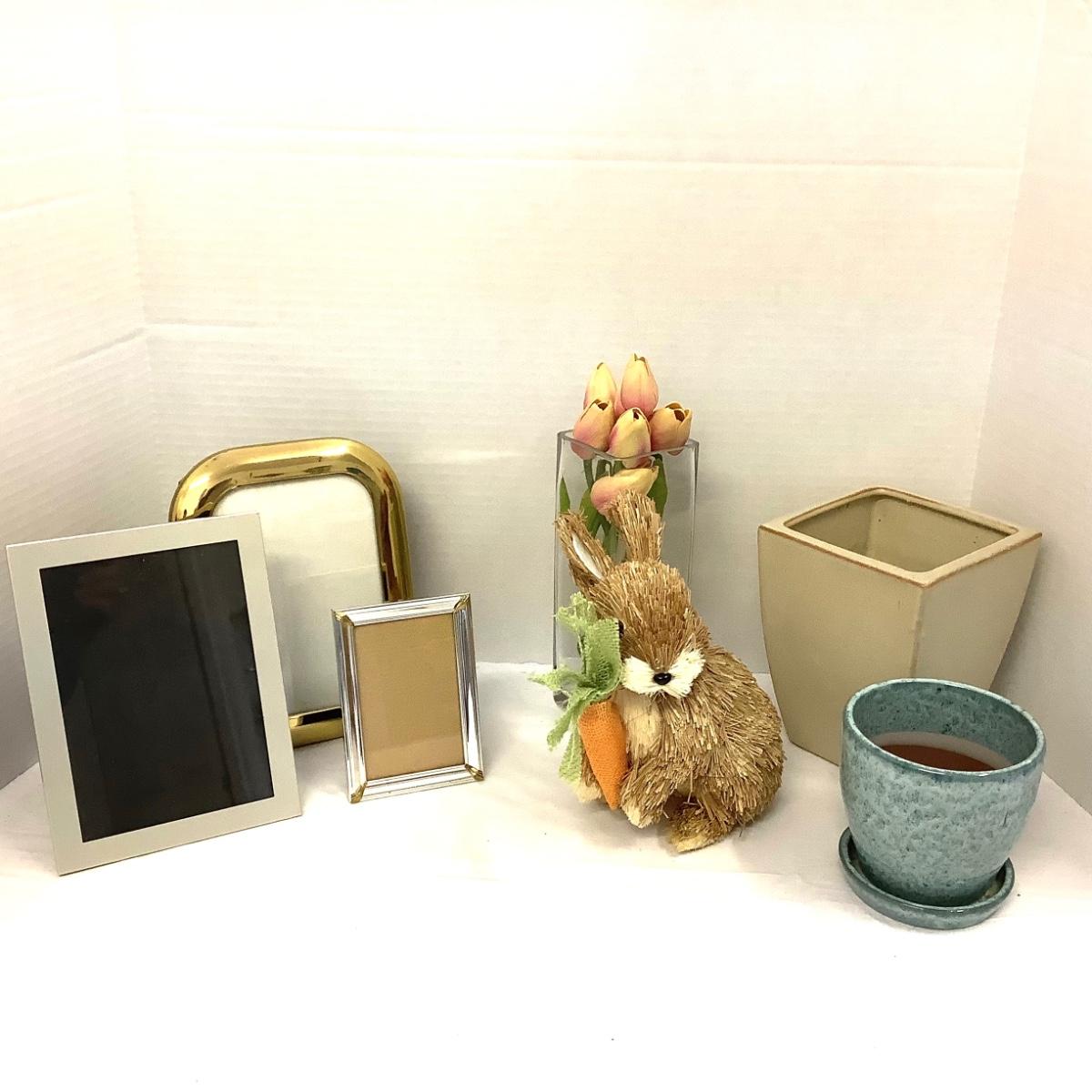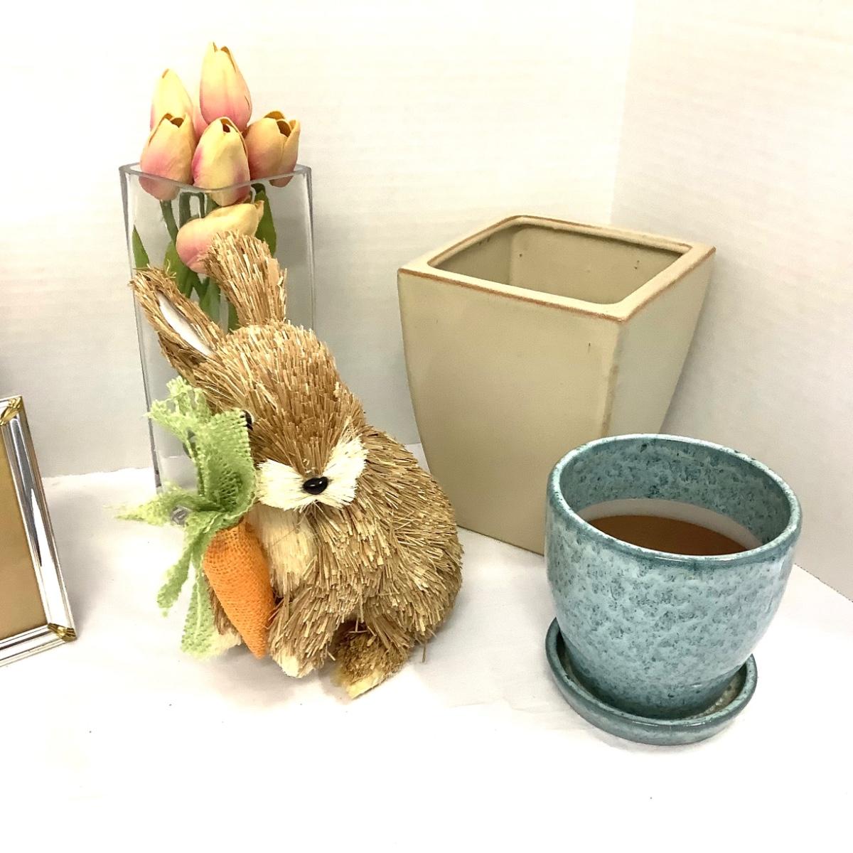 400 Lot of Rabbit Decor with 3 Frames, Clear Vase with Faux Tulips and Planters