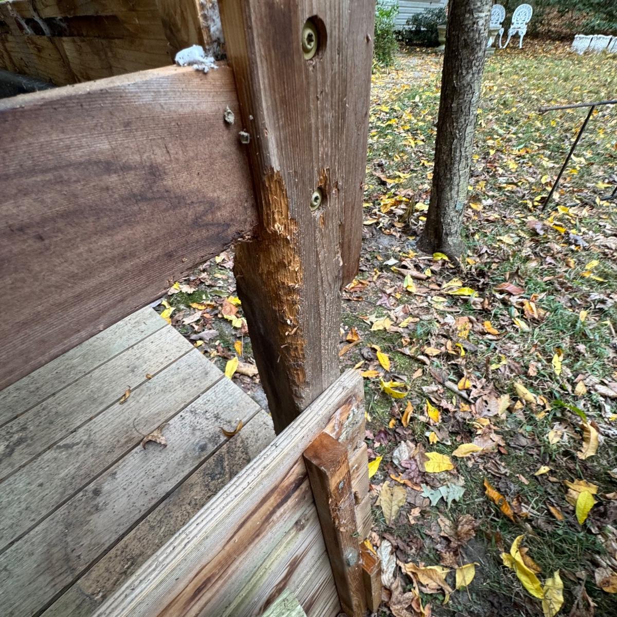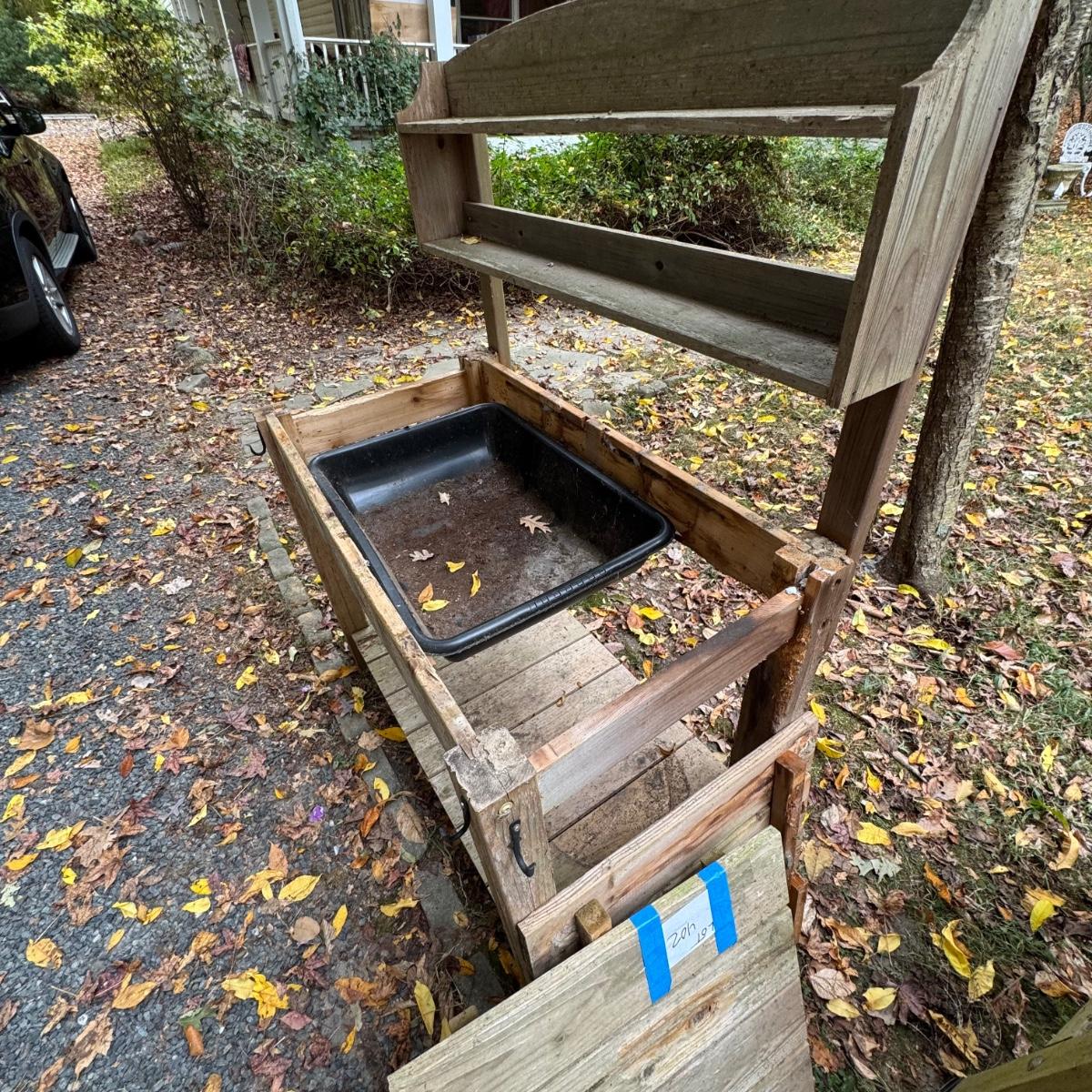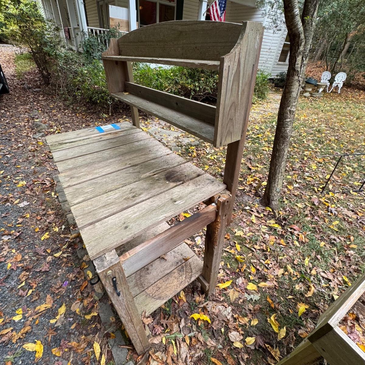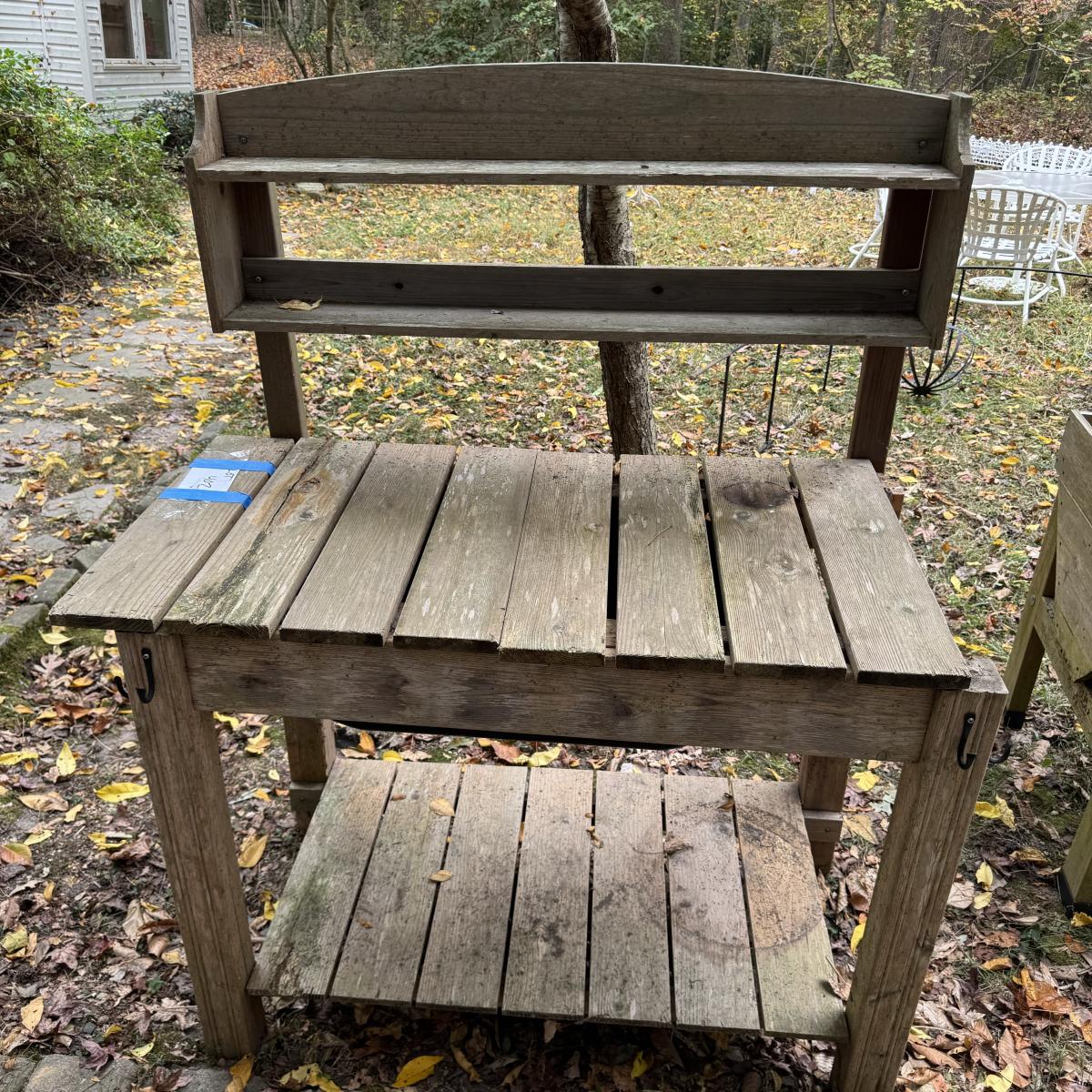 Wooden Potting Table. Overall good condition, however, there are some areas that appeared to be chewed on by squirrels. Overall structurally sound for age. Table has a vertical raised potting table shelf with horizontal shelves, quantity two. Please see pics for details.