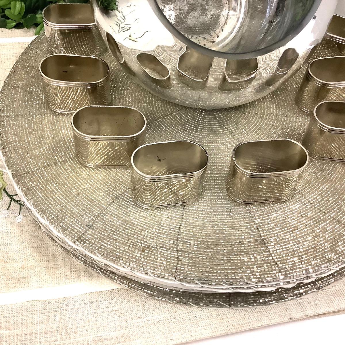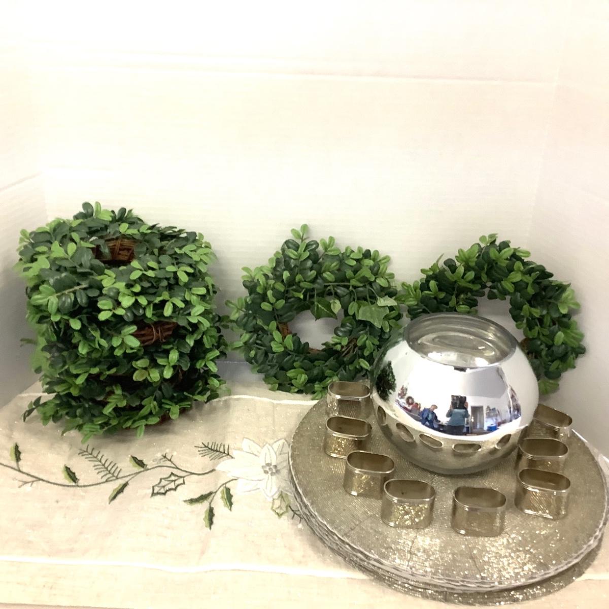 Set of 8 silver placemats 12" diameter, 7 mini wreaths measuring 8" diameter