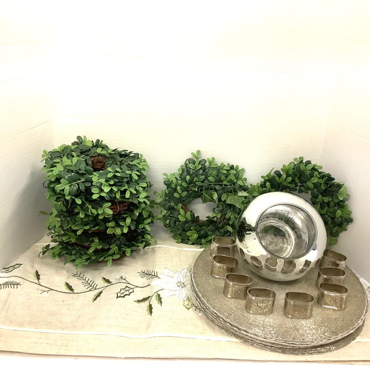 403 Holiday Runner by Chestnut Lane, Beaded Silver Placemats, Mini Wreaths, Silver Vase