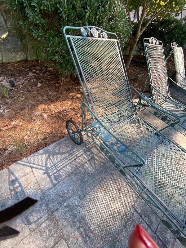 Pair of vintage Woodard wrought iron green colored lounge chairs with adjustable back