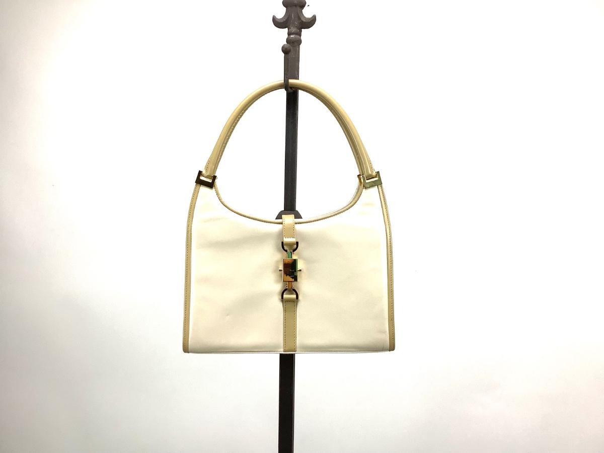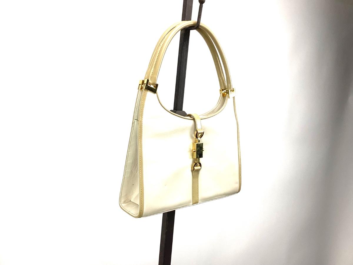 The handbag is cream leather with gold tone hardware-like new. It is 14" x 11".