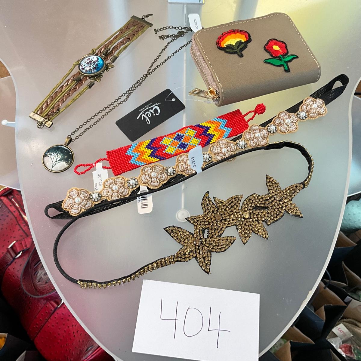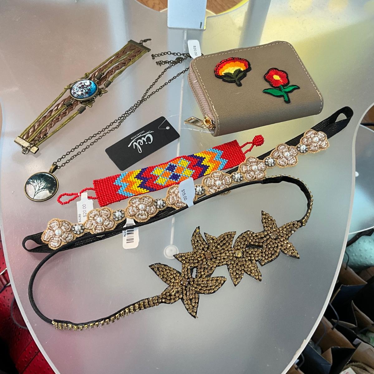 Cuff bracelet, floral wallet, beaded bracelet and 2 beaded headbands