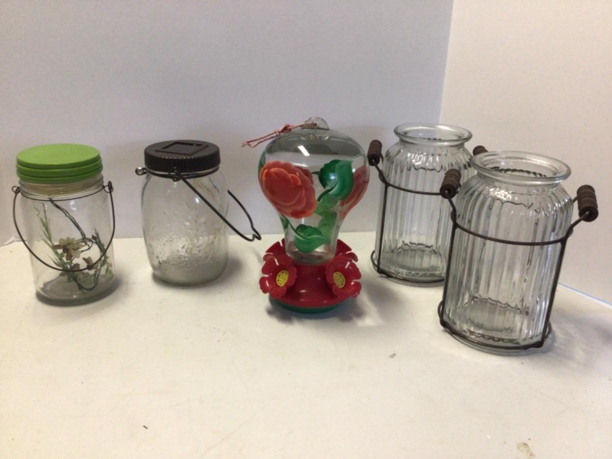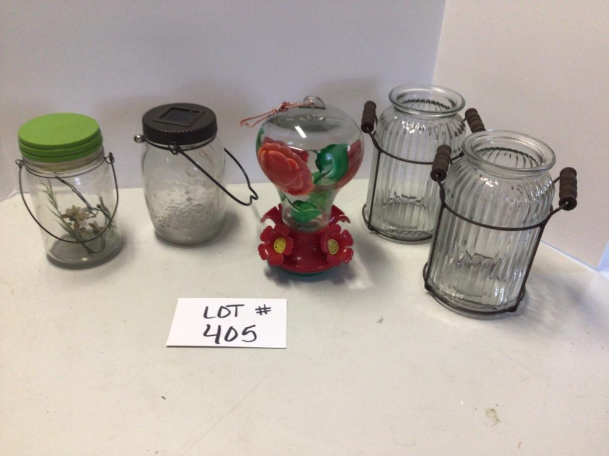 405 Lot of Firefly Jars, Hummingbird Feeder, Jars / Votives