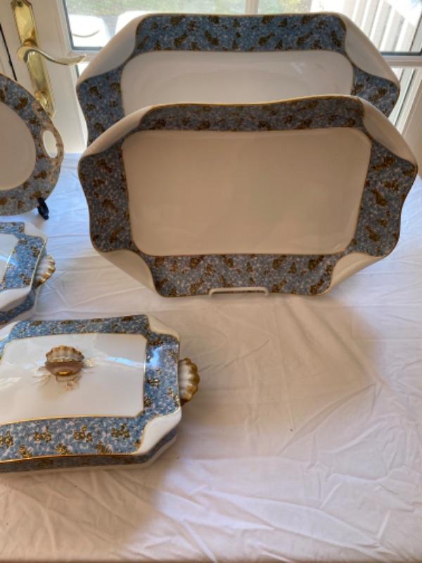 11small butter pats , 11 -small fruit bowls, 2 large platters, 2 large rectangle covered serving dishes, 2 square covered vegetable bowls, 2 open vegetable bowls, 2 round handled serving plates, 11- dinner plates