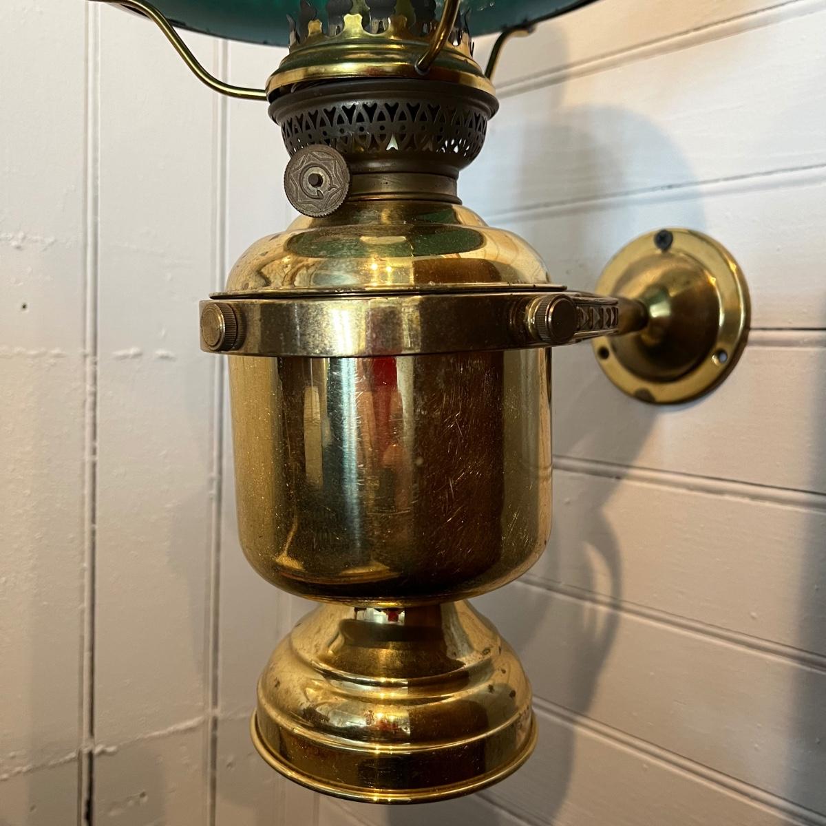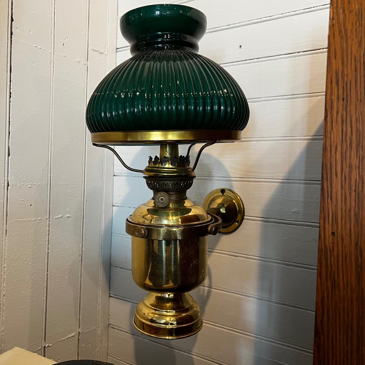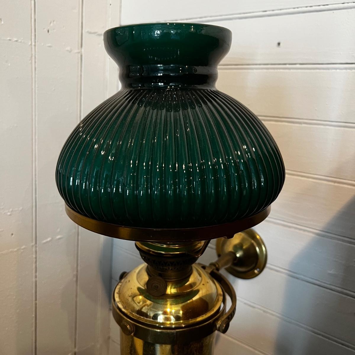 N407 Vintage Brass Oil Bracket Lamp with Green Ribbed Glass Shade
