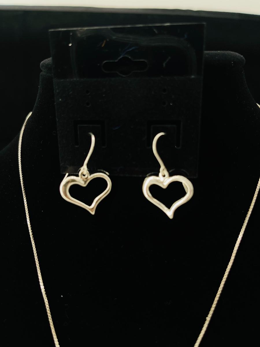 Pendant measures 3/4” and heart hoop earrings dangle 1”. Earrings = 3 grams. Necklace = 5 grams.