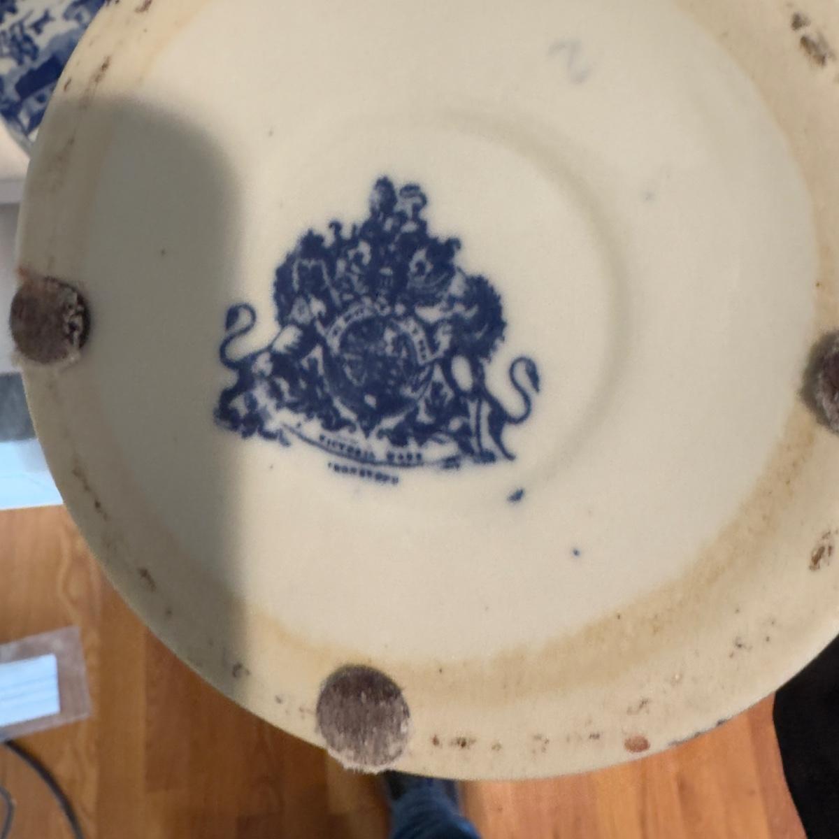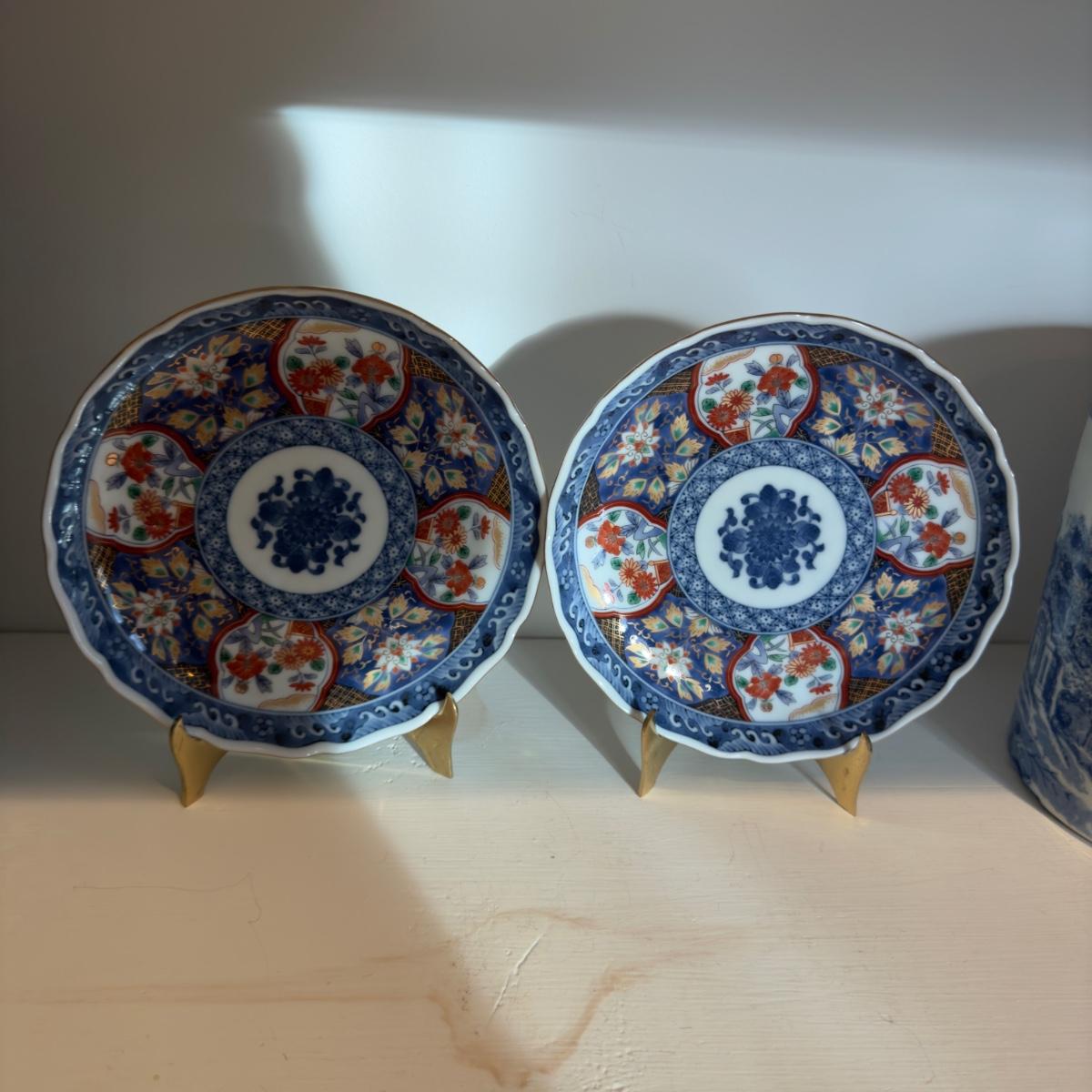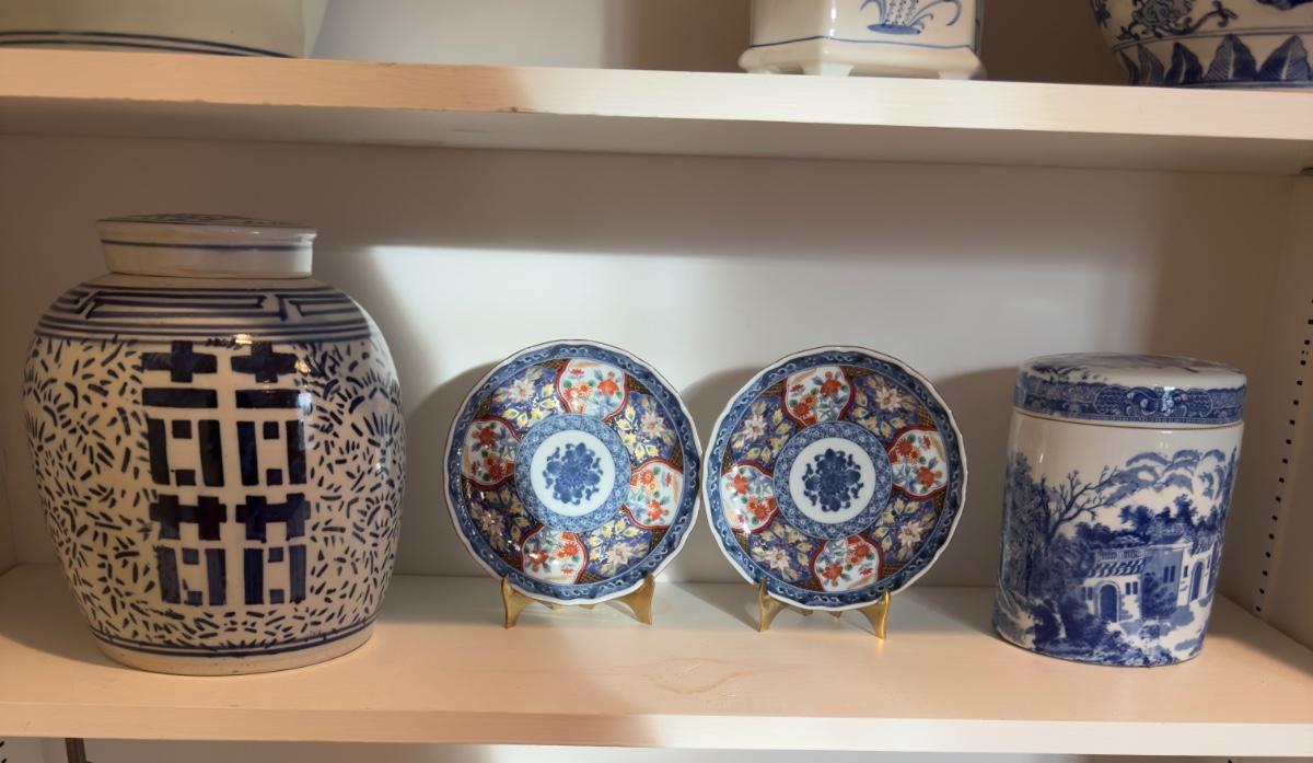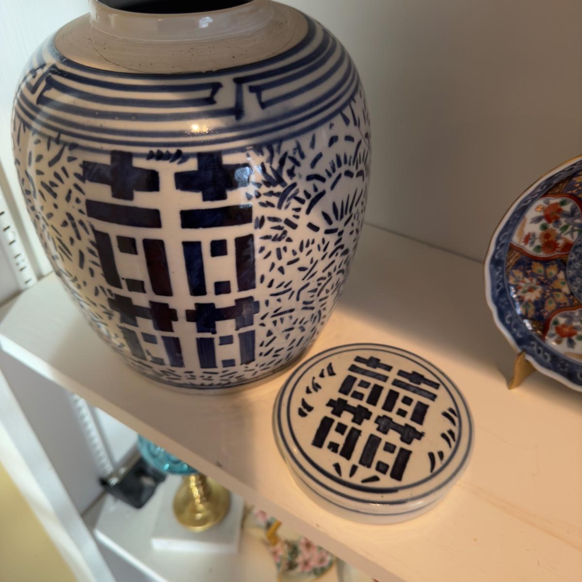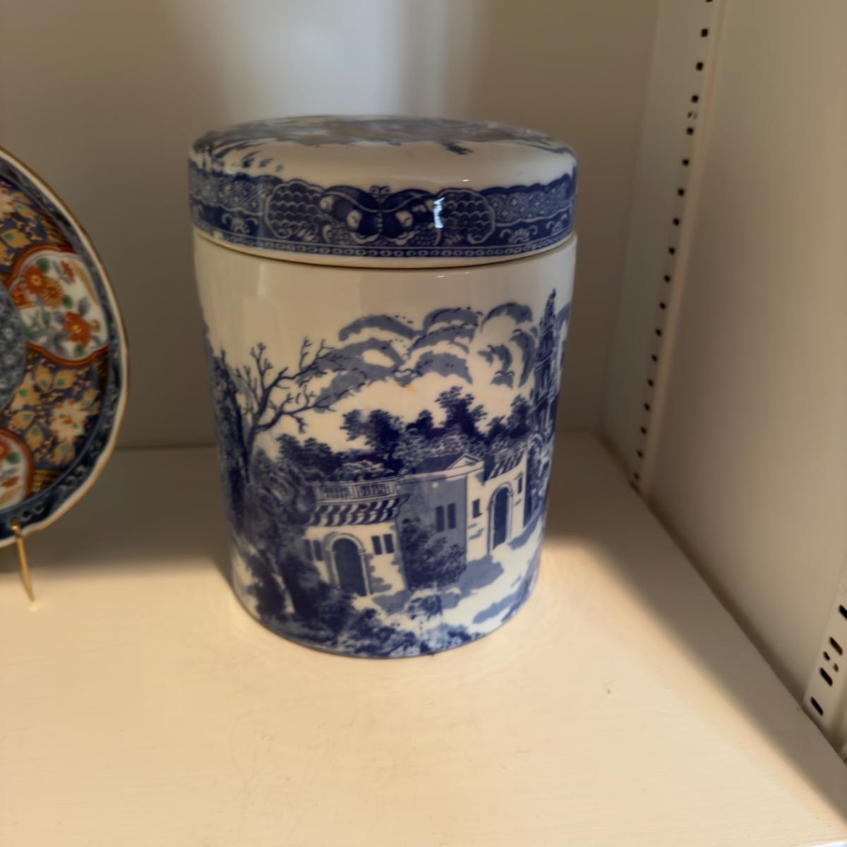 409 Vintage Blue and White Ginger Jar with Canister and Two Decorative Plates