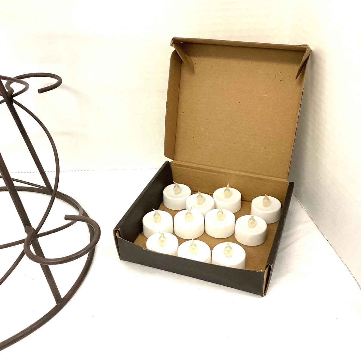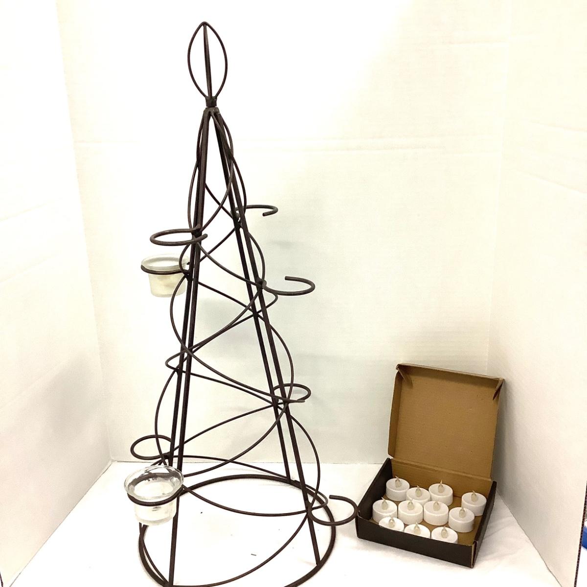 Metal tree measuring 27" high x 11" diameter base, with box of LED Tea Lights (11)