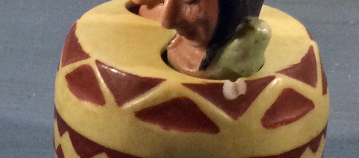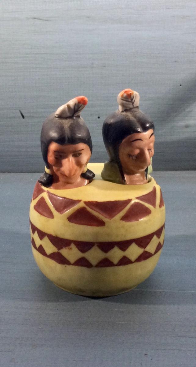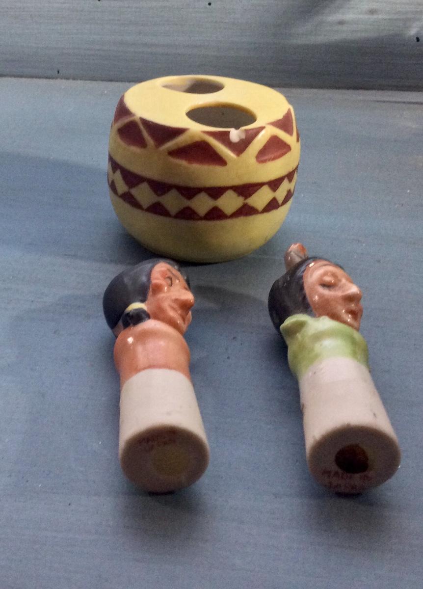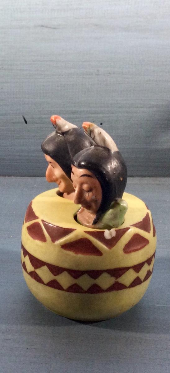 40JO -Indian nodders in holder, as-is chip on holder see pictures. Back of one sh has been glued and is missing piece.