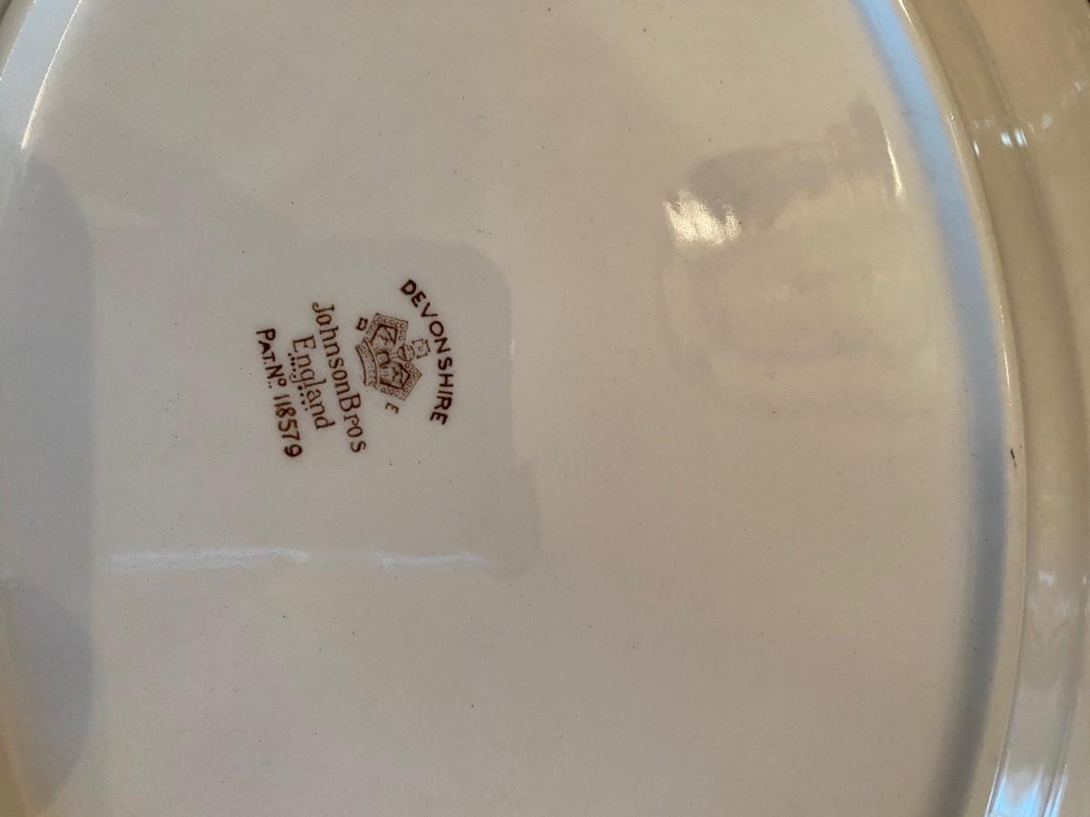 43-piece set of vintage Devonshire Johnson Brothers, England bone china. 5 cups, 8 saucers, 7 dinner plates, 8 bread plates, 8 soup bowls, 9-1/2" platter, covered sugar & creamer, vegtable bnowl. All in very good, vintage condition.