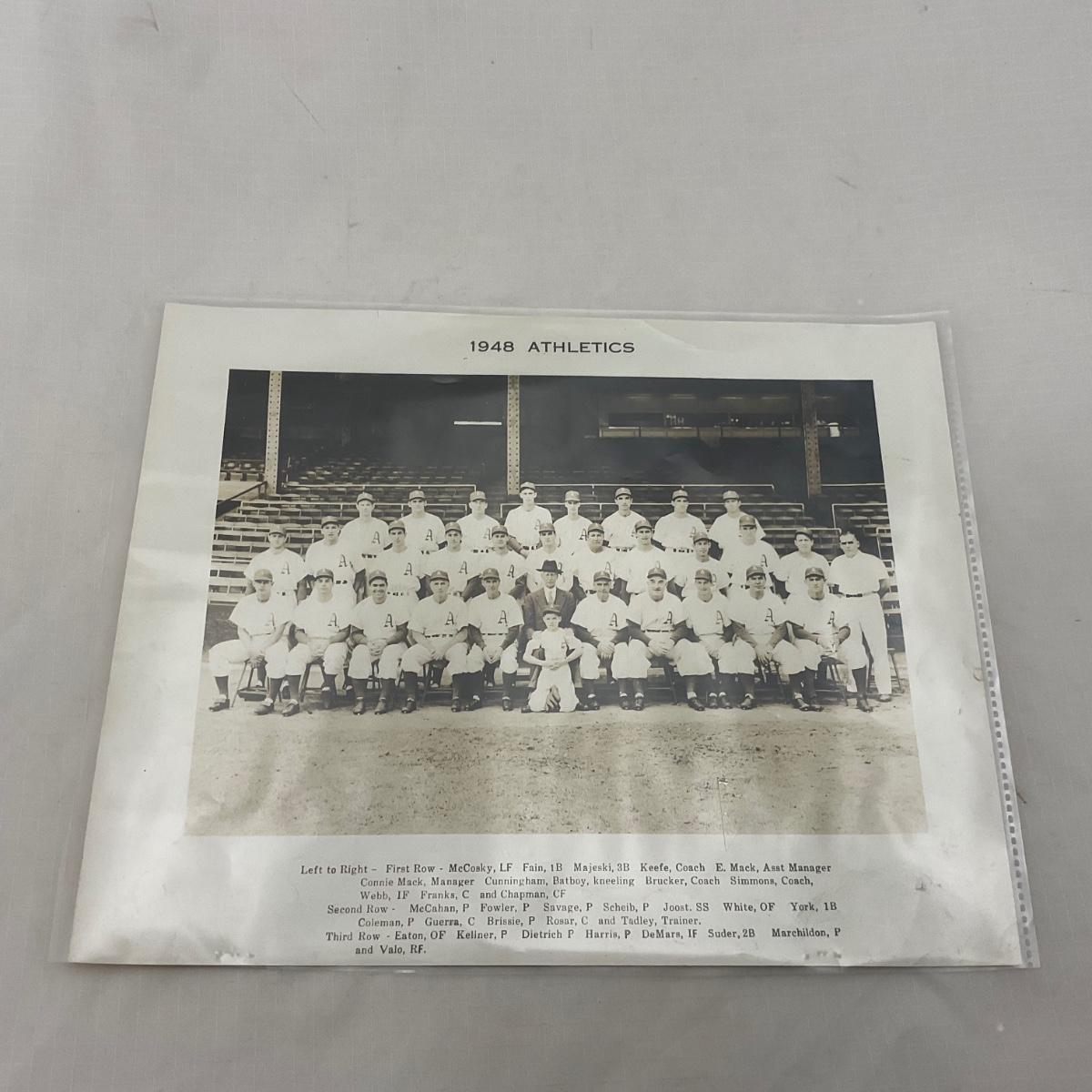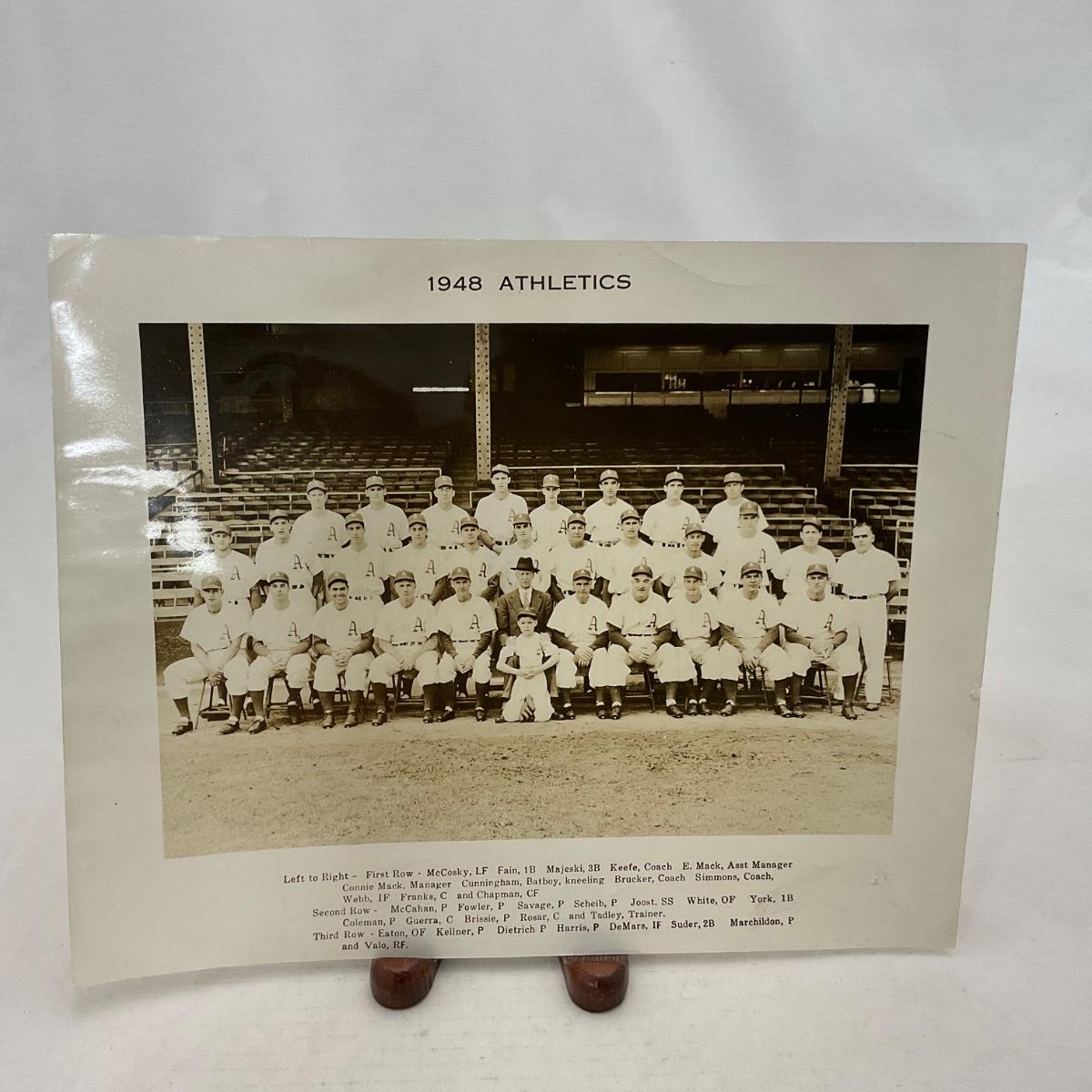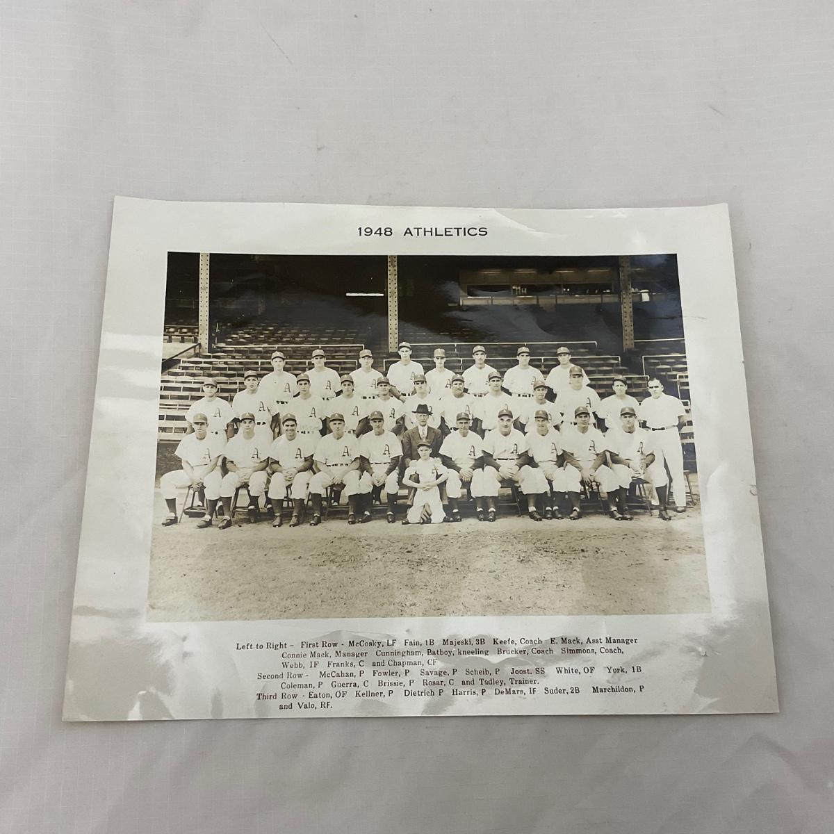 One 1948 Original Philadelphia athletics team photo 8 inches by 10 inches. Please see photos for details and condition. ::: Shipping is available on this lot. If you require shipping you must let us know at the close of the auction. We will coordinate with you after the item has been won. Shipping fees will include insurance up to or exceeding the value of all items being mailed. If you have any questions regarding this lot please contact the auctioneer either via this website, by direct email or by phone. PICK UP TIMES and other important information can be found in the TERMS and DESCRIPTION of the auction. Please take a look for pertinent information. Thanks!