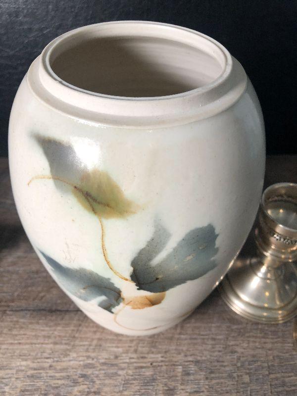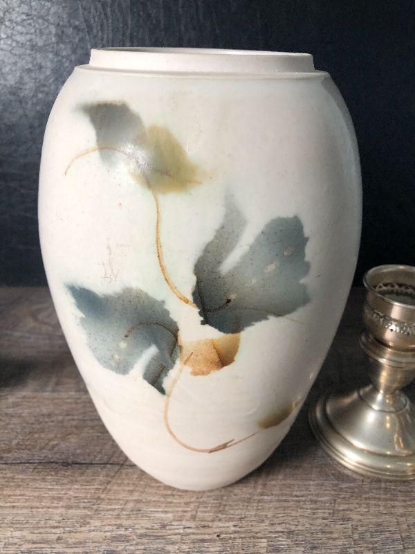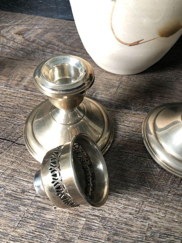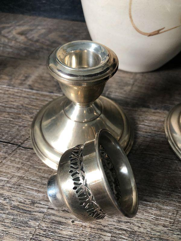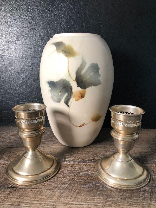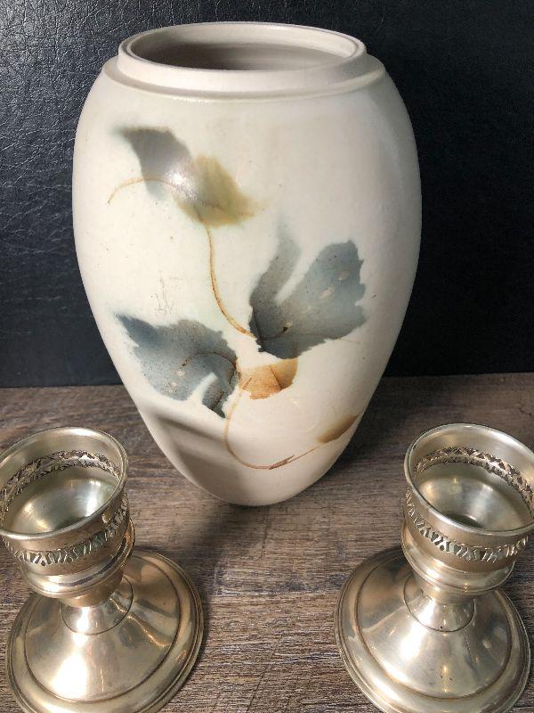 Aurora Pottery Studio vase and sterling weighted candlesticks.