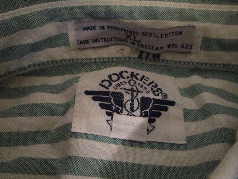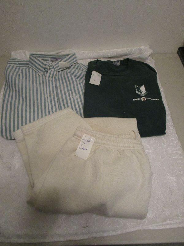 Size XL Dockers green and white stripe short sleeve; Anvil green t-shirt; Fruit of the Loom natural color heavy weight sweat pants