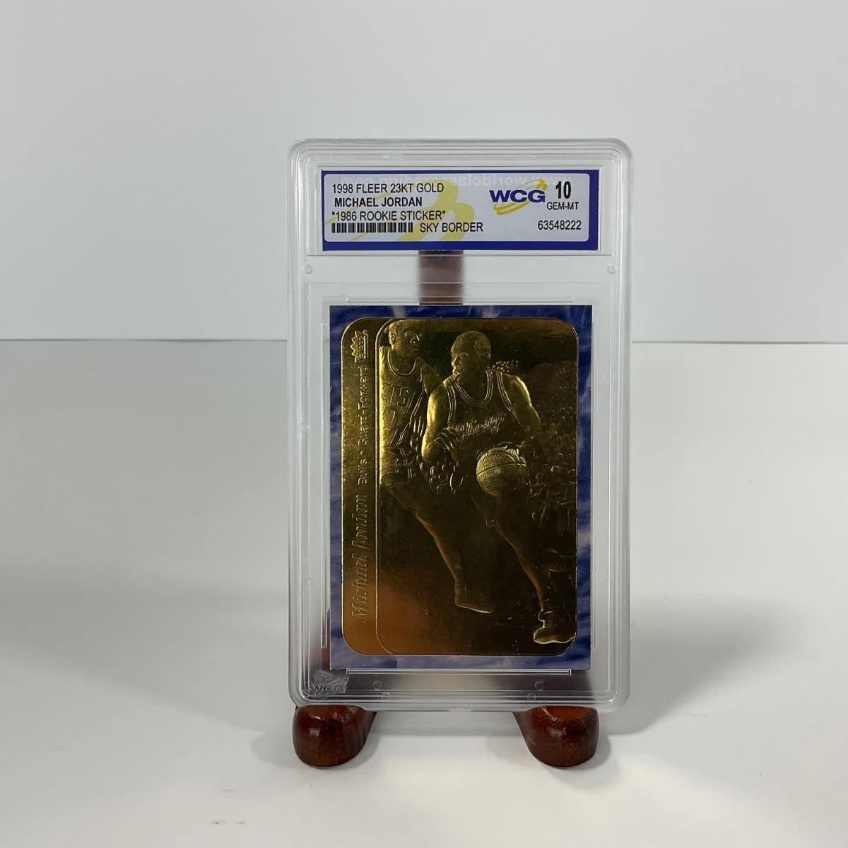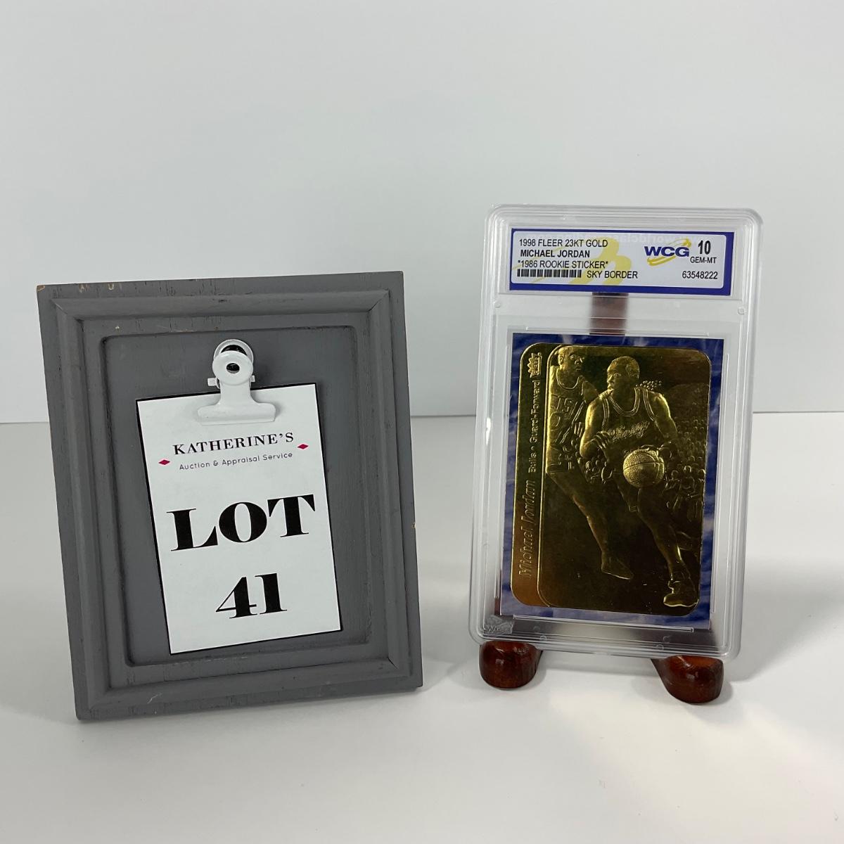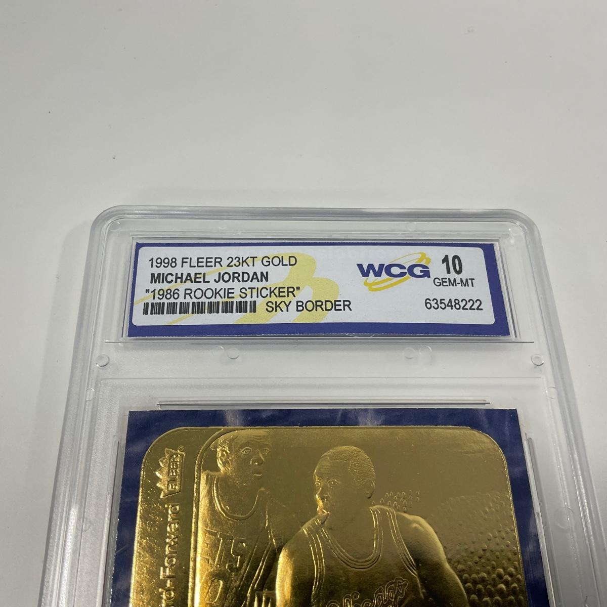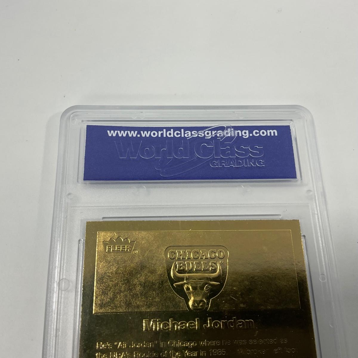 One graded 1998 Fleer 23kt Gold Michael Jordan graded 10 GEM-MT card. In awesome shape. Please see photos for details and condition. ::: Shipping is available on this lot. If you require shipping you must let us know at the close of the auction. We will coordinate with you after the item has been won. Shipping fees will include insurance up to or exceeding the value of all items being mailed. If you have any questions regarding this lot please contact the auctioneer either via this website, by direct email or by phone. PICK UP TIMES and other important information can be found in the TERMS and DESCRIPTION of the auction. Please take a look for pertinent information. Thanks!