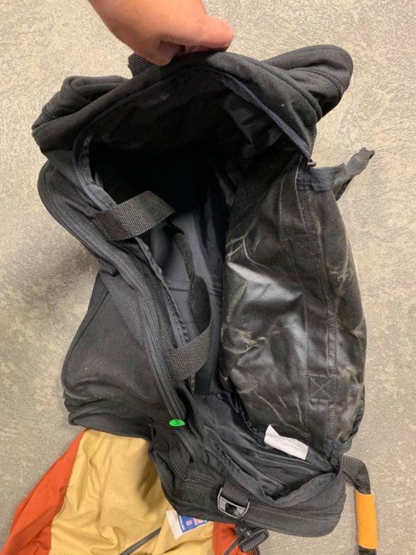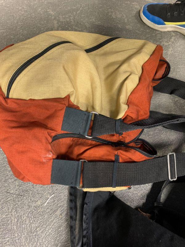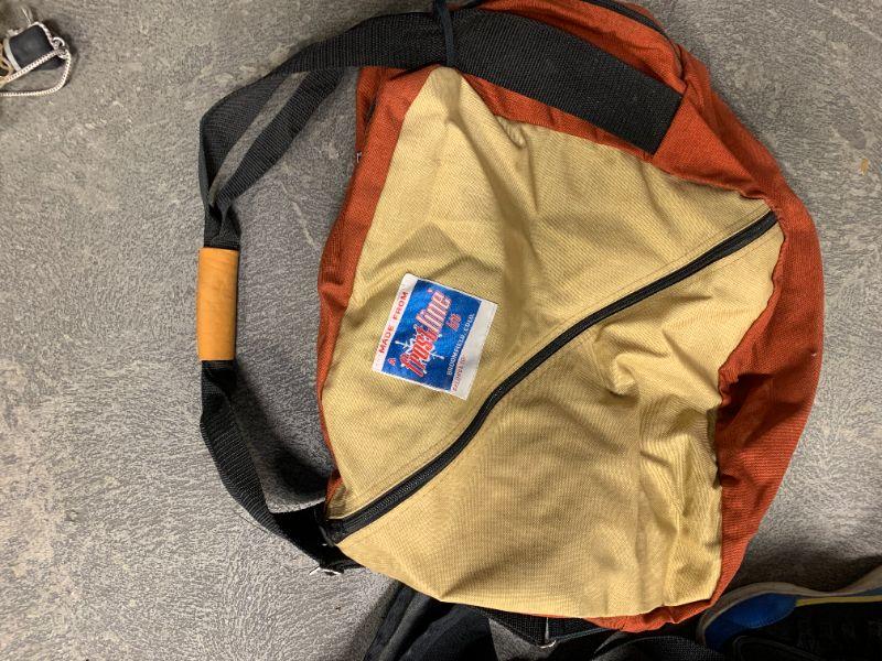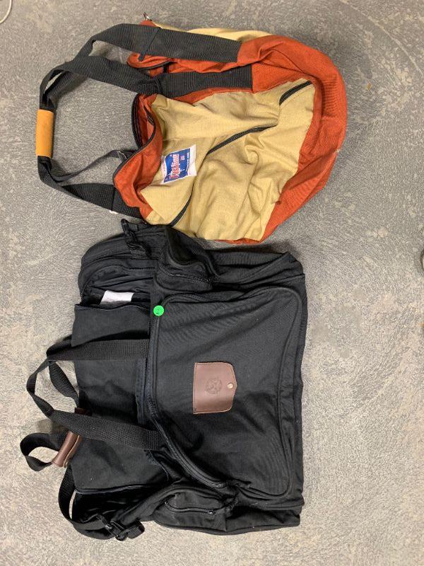 Eddie Bauer black duffle and vintage orange & yellow bag.