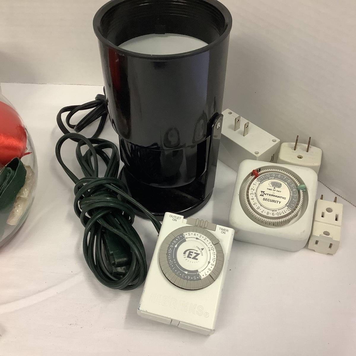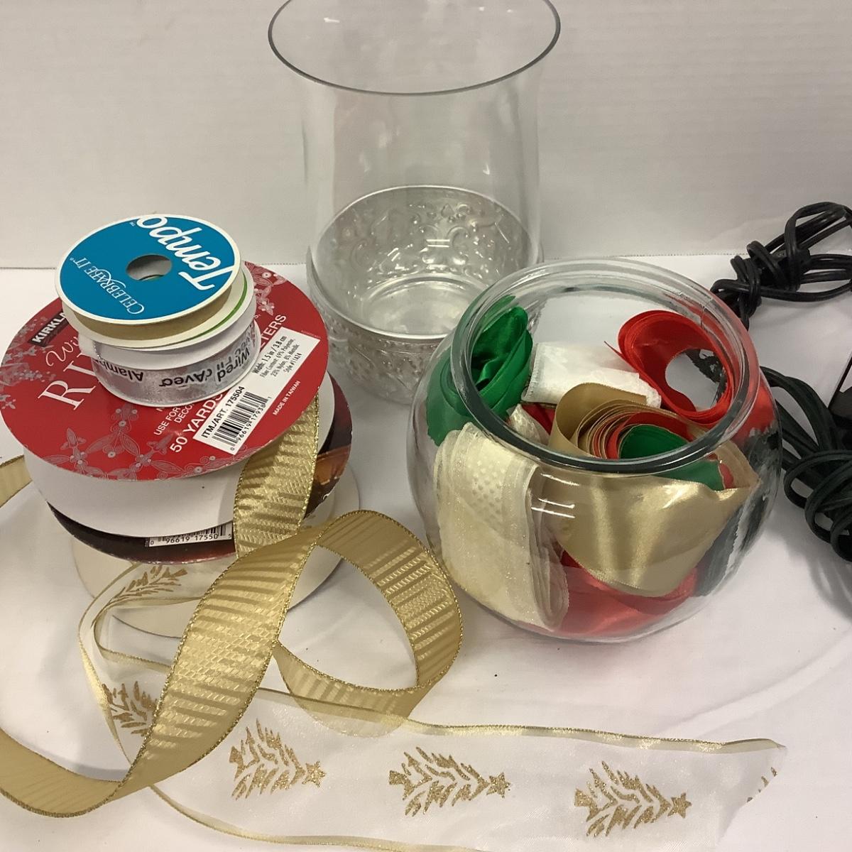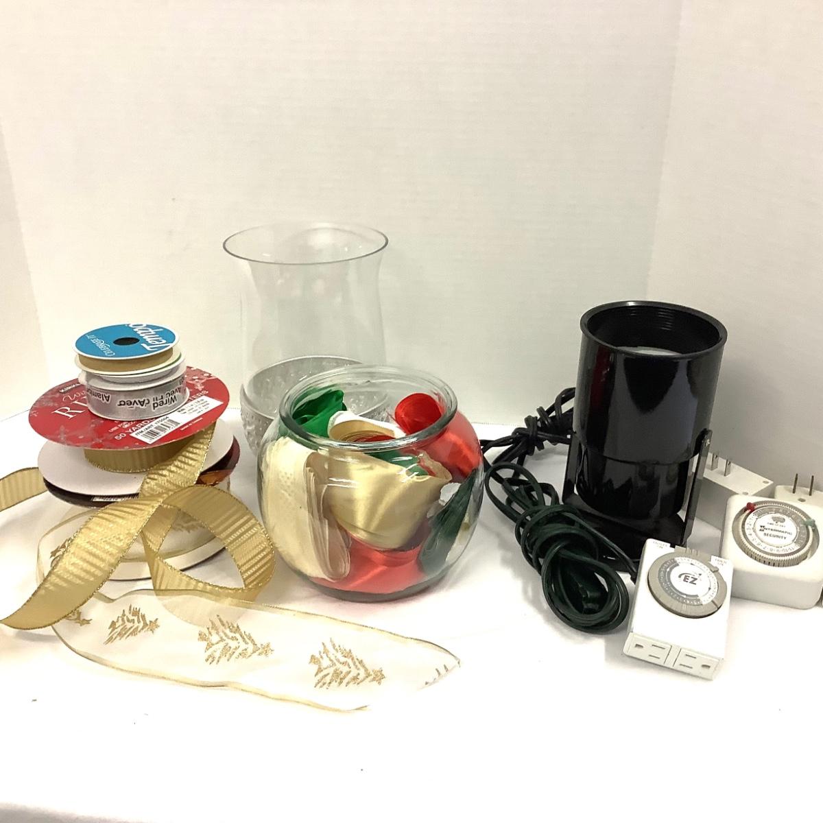 Spot light with timers, bowl of ribbon cuttings and several rolls of ribbon some partially used .