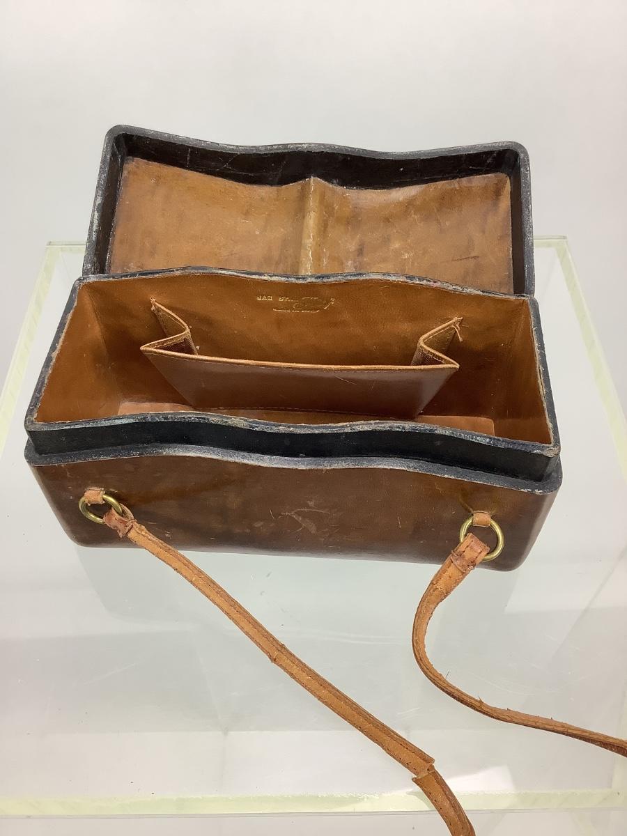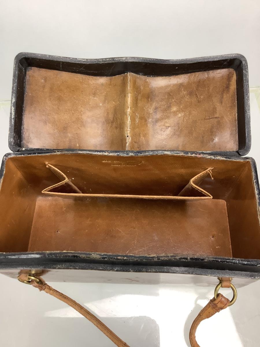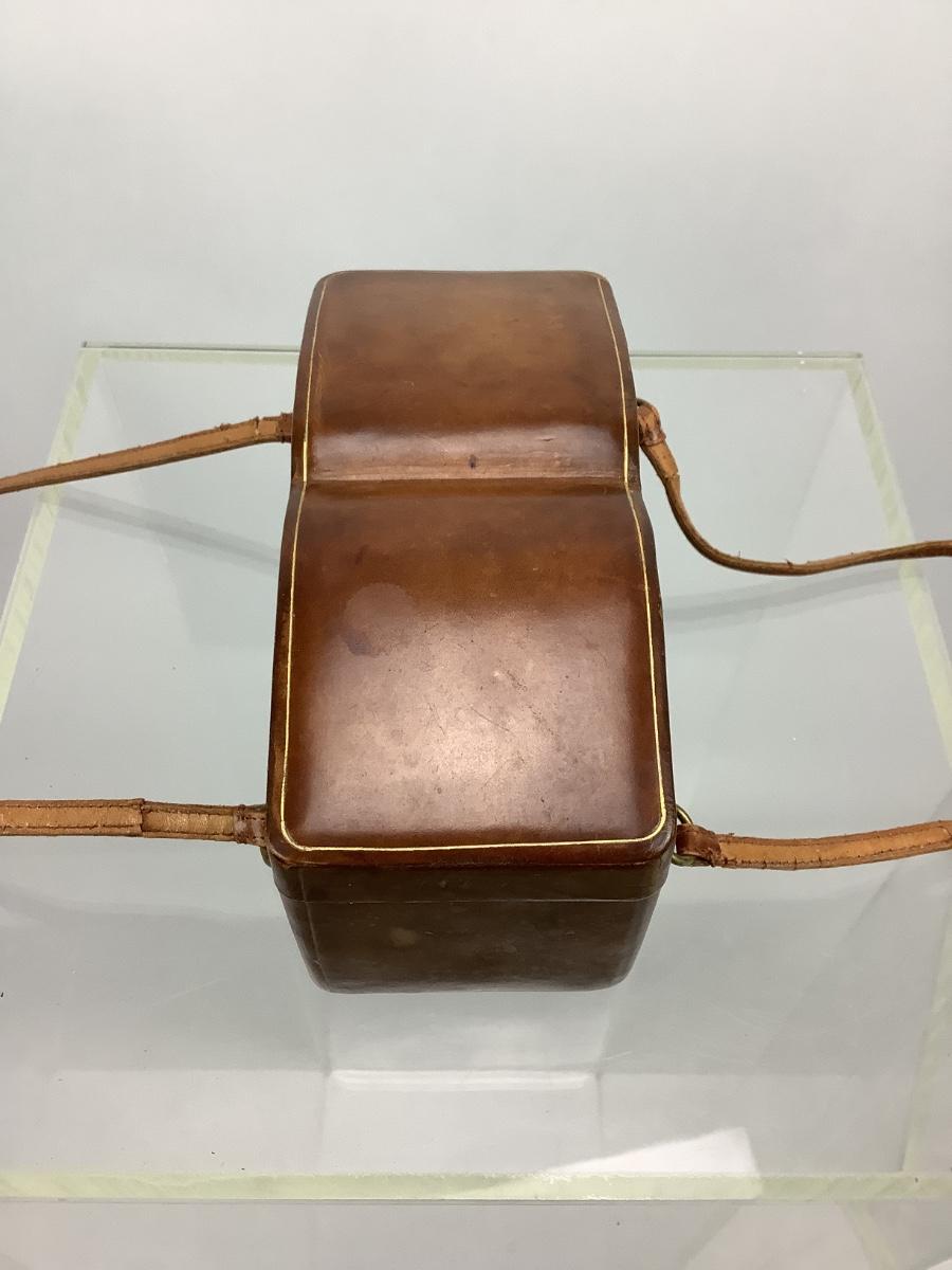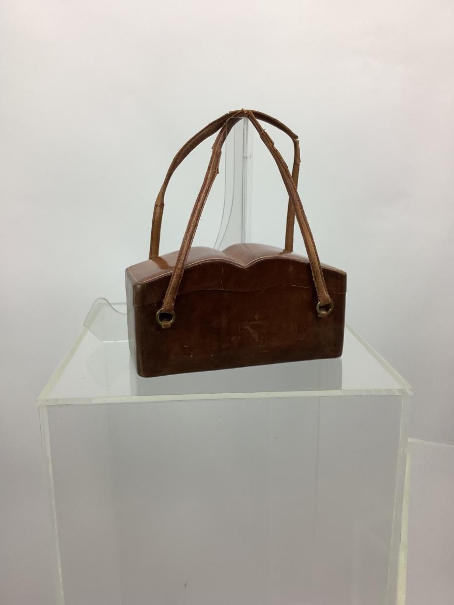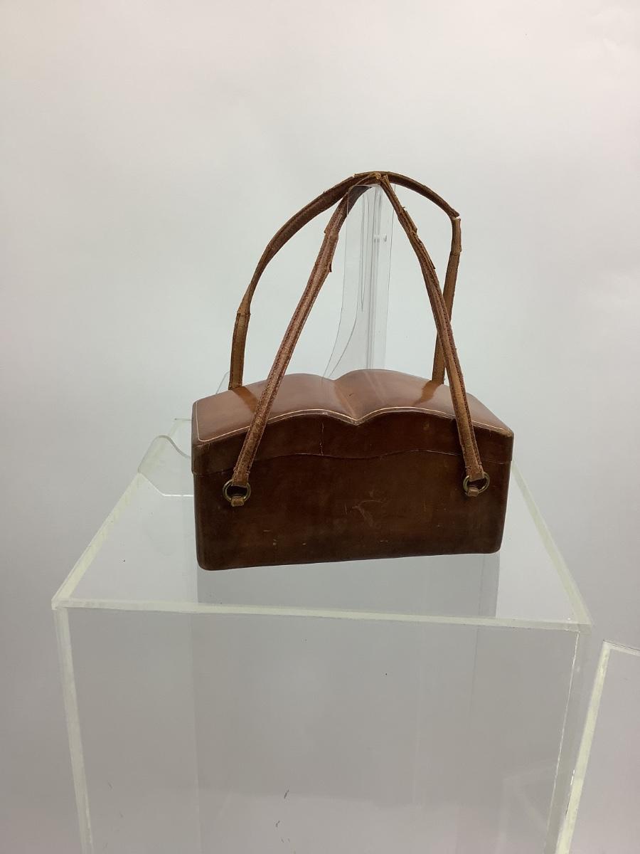 Purse is a brown leather box with lid and strap, there is gold trim at the top, measures 7" x 3" x 3".