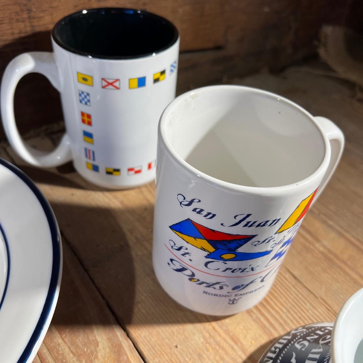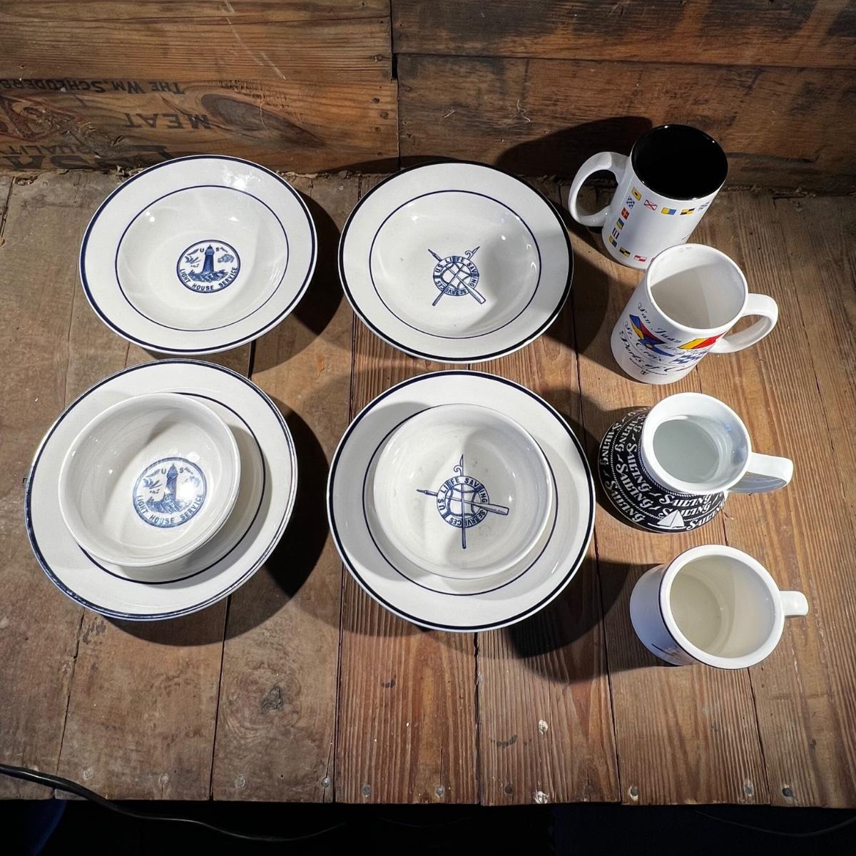 2 bowls, 4 plates, 4 mugs, 2 collapsible cups