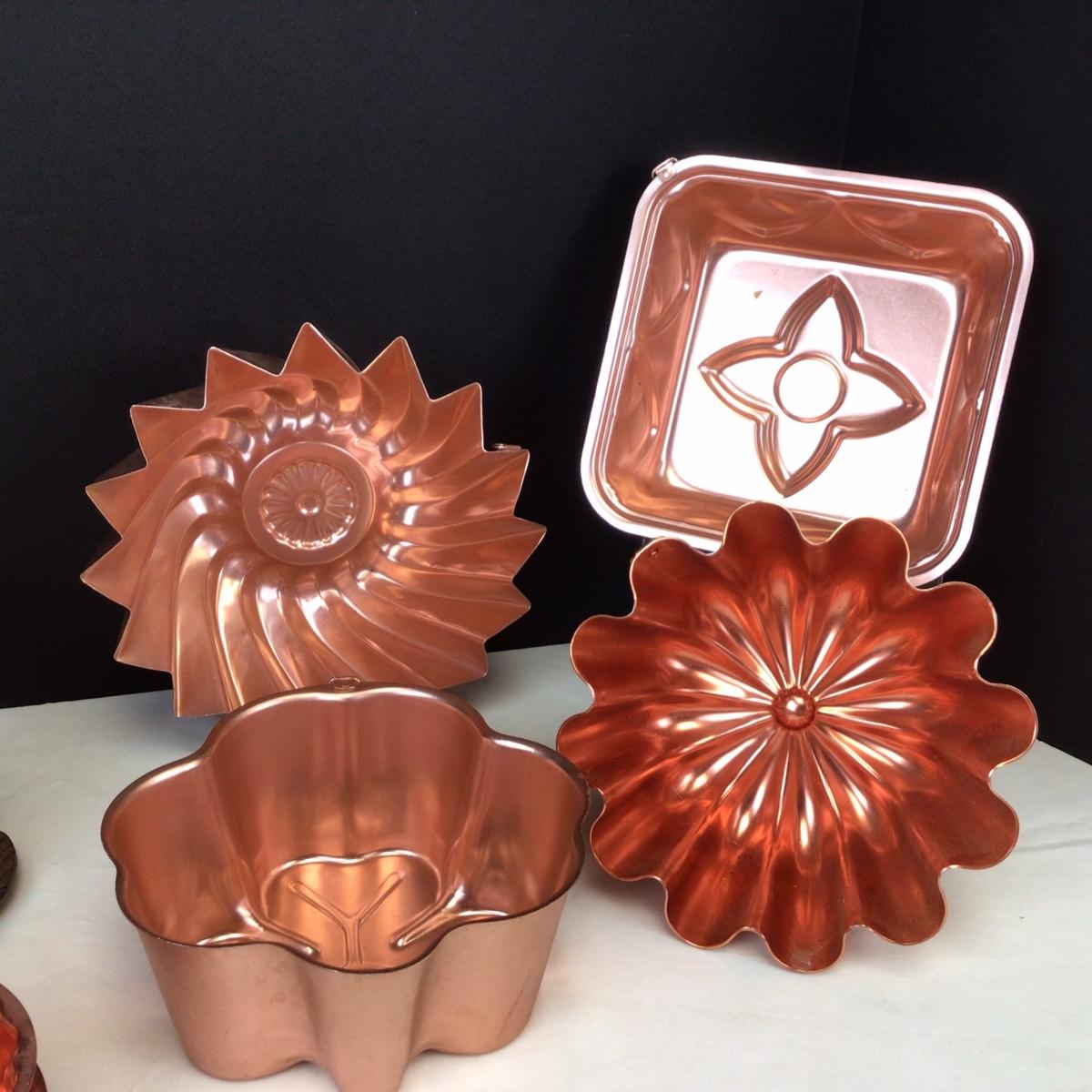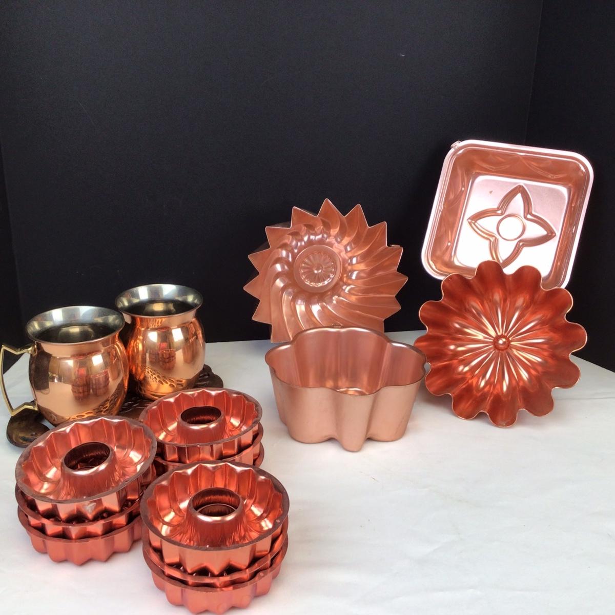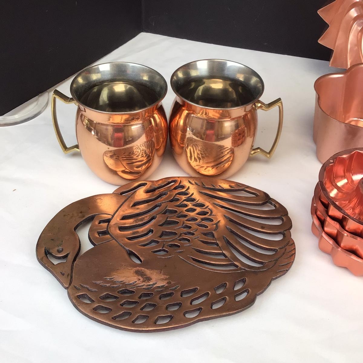 There are 13 copper molds, 1 trivet and 2 Moscow mule copper cups.