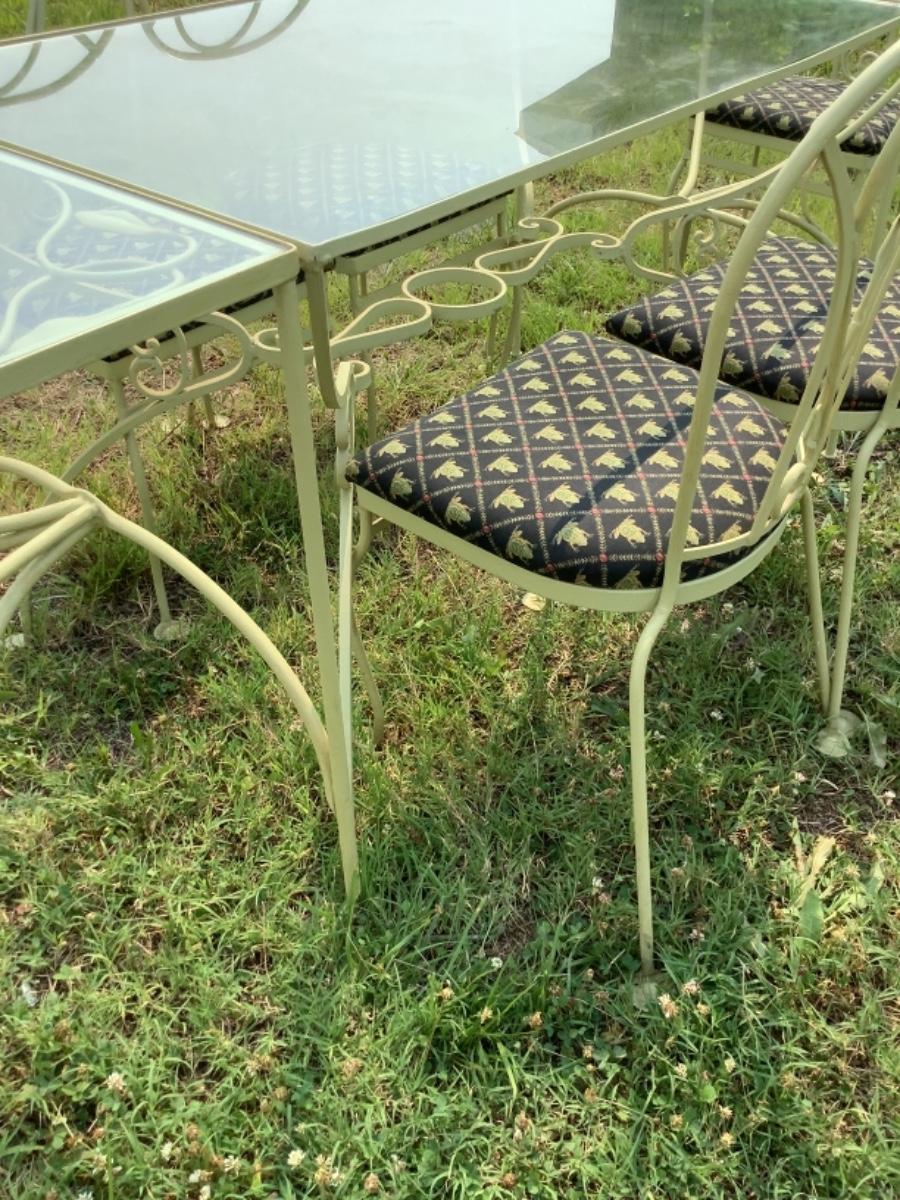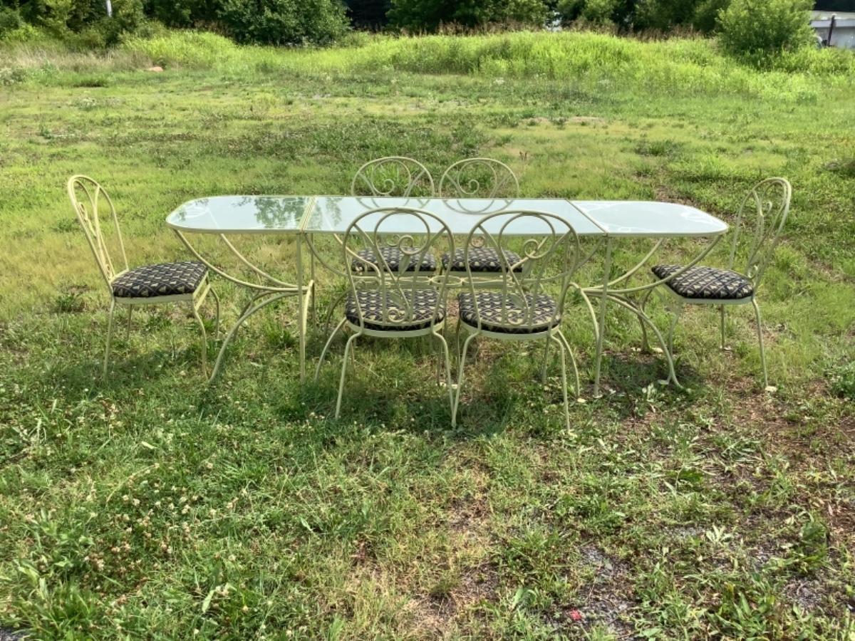415. Mid Century 3 pc. Wrought Iron Table with Glass Top & 6  Chairs