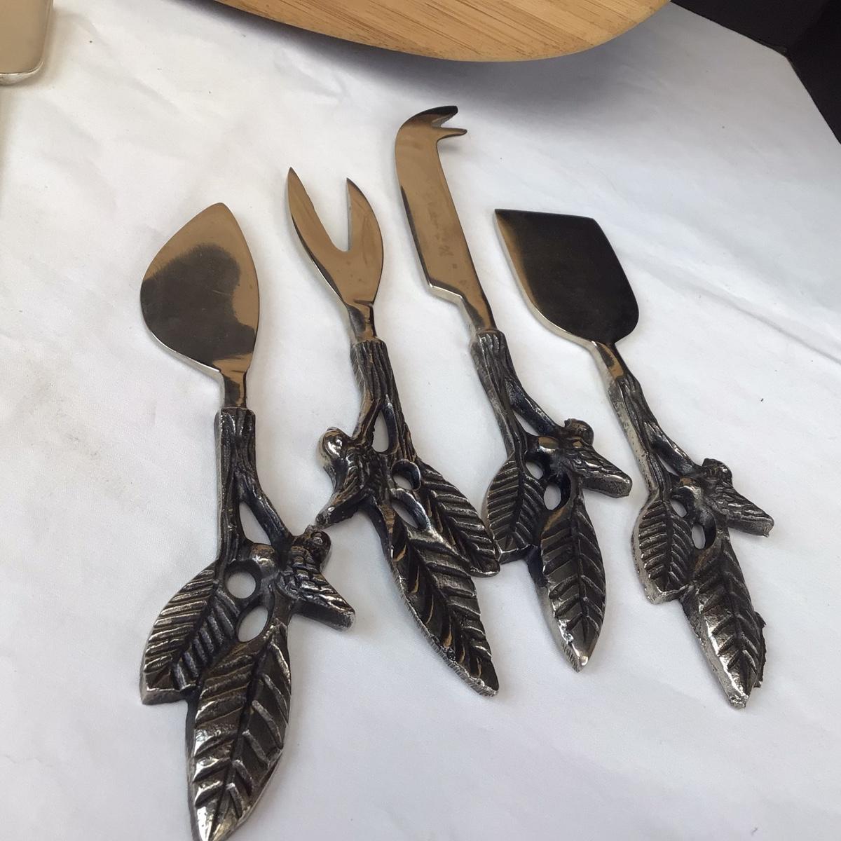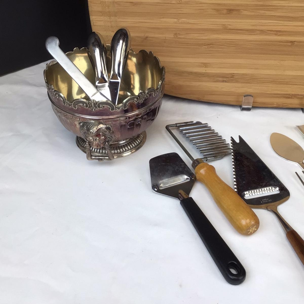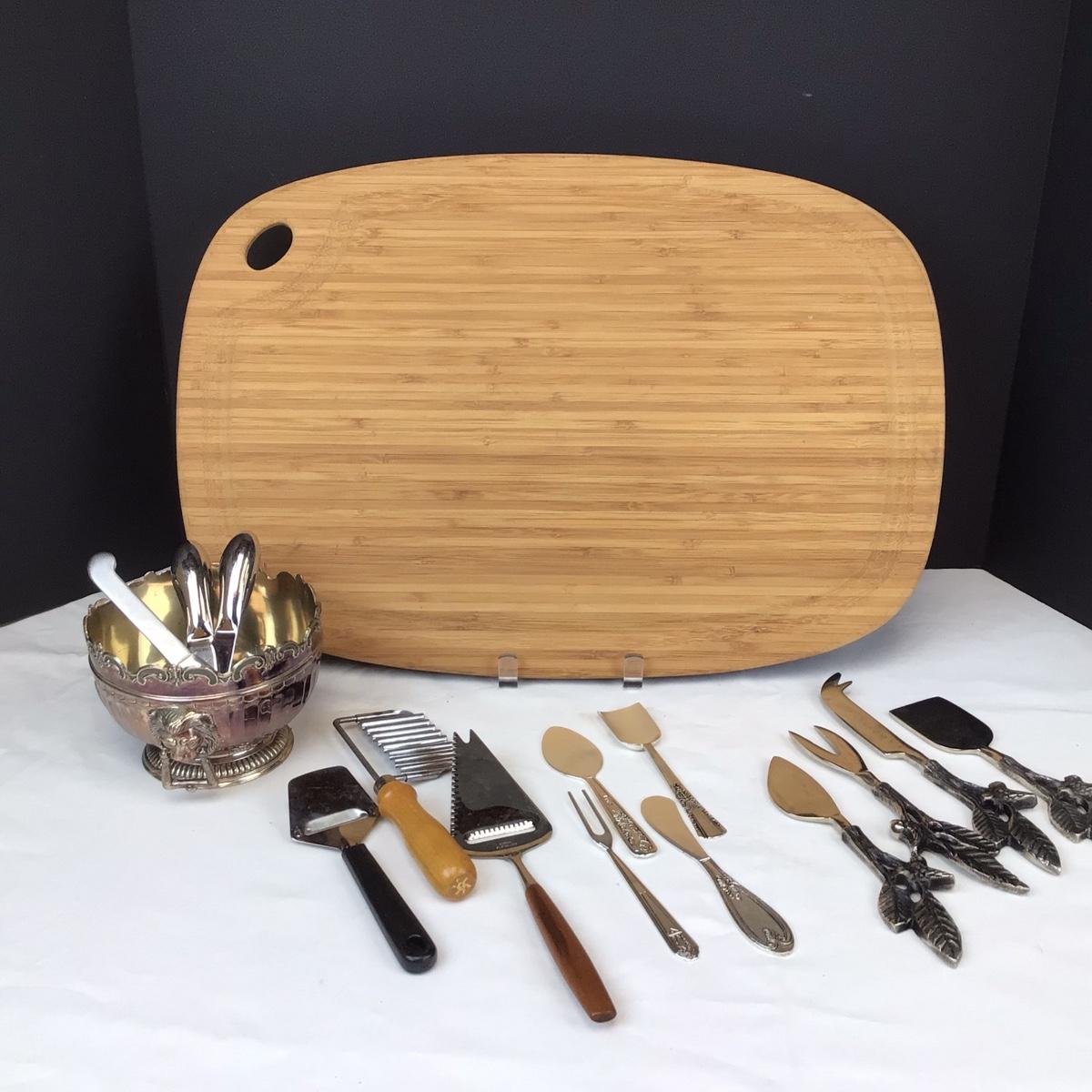 Lot contains assorted cheese knives, spreaders and large cutting board.